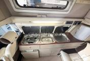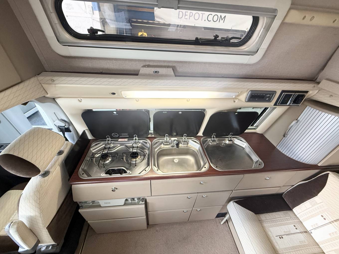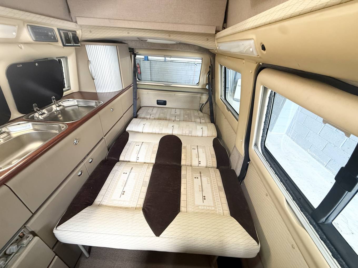 This 4-berth camper features a manual gearbox, 4 seat belts, a comfortable rock and roll bed, and an overhead double bed in the high-top roof. The compact yet functional kitchen includes a 2-ring gas hob, sink, and handy storage. Swivel front seats open up the living space, and a built-in diesiel heater keeps you cosy in all seasons.