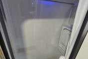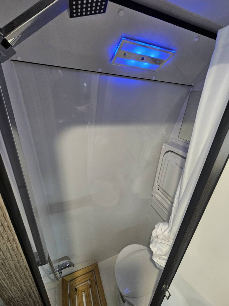 The fully lined washroom includes a rainfall style shower, Dometic electric toilet and fold down hand basin, with integrated LED lighting.