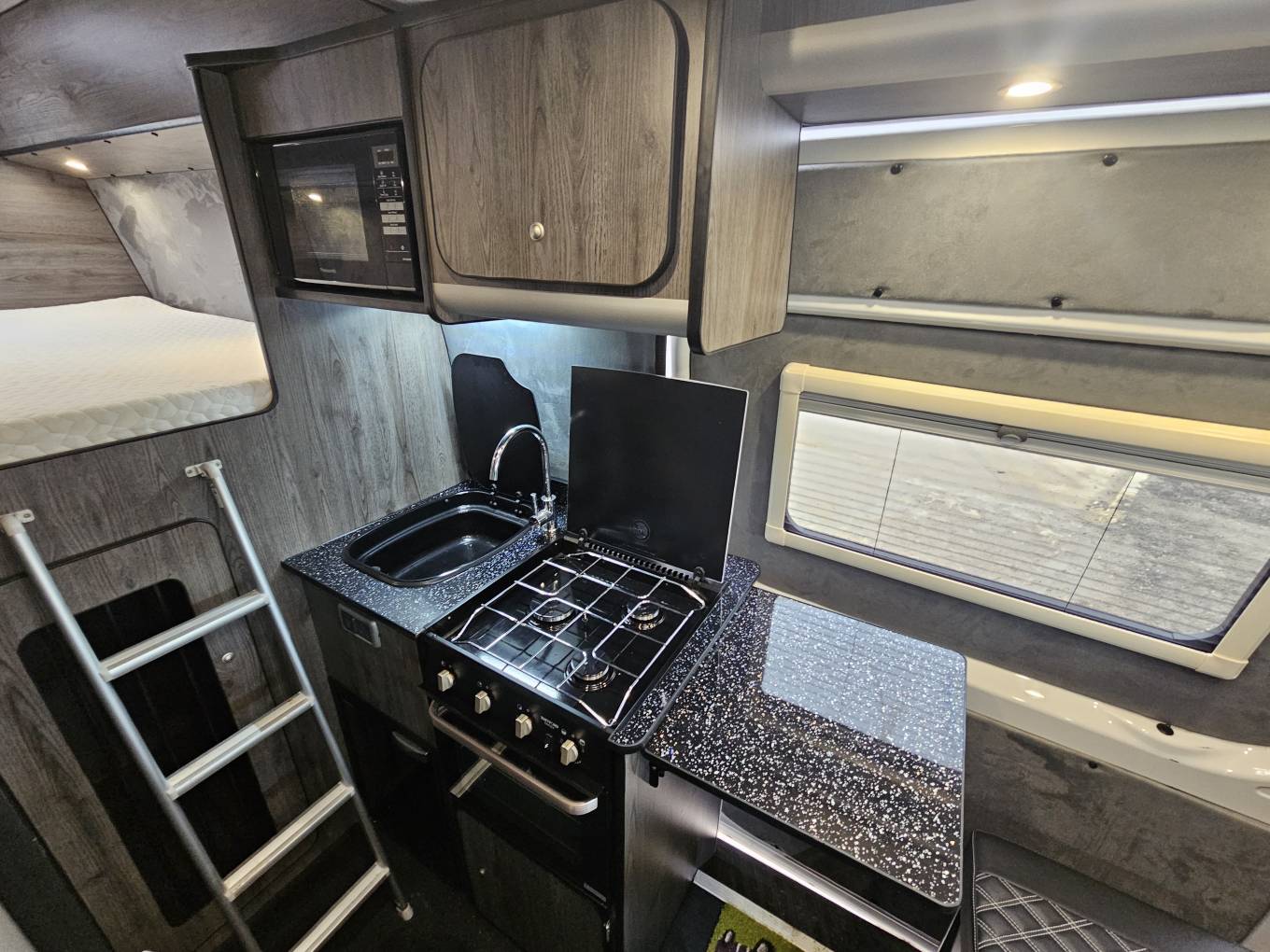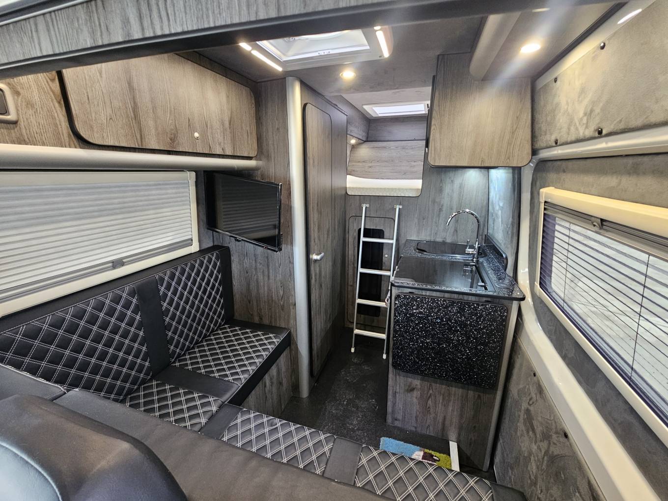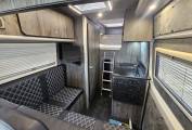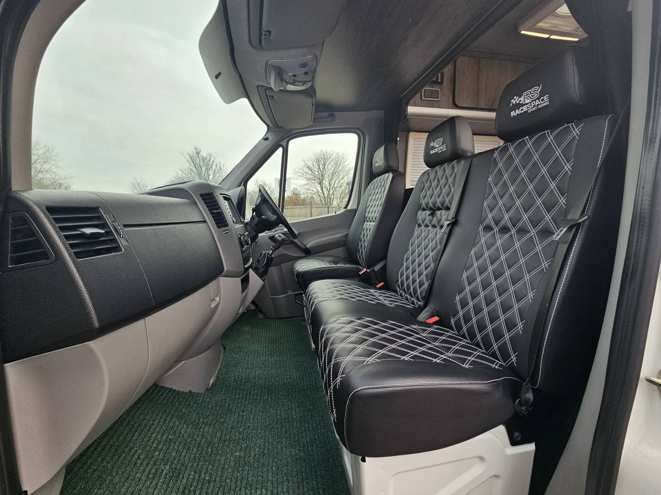 The interior is finished in Africa chestnut cabinetry with grey wall panelling, soft touch lining, black Altro flooring and black sparkle worktops. Upgraded Bentley stitch upholstery with RaceSpace logo headrests gives a cohesive, premium finish. There are two side windows with integrated blinds, two skylights with flyscreens and blinds, plus an additional roof pod skylight.