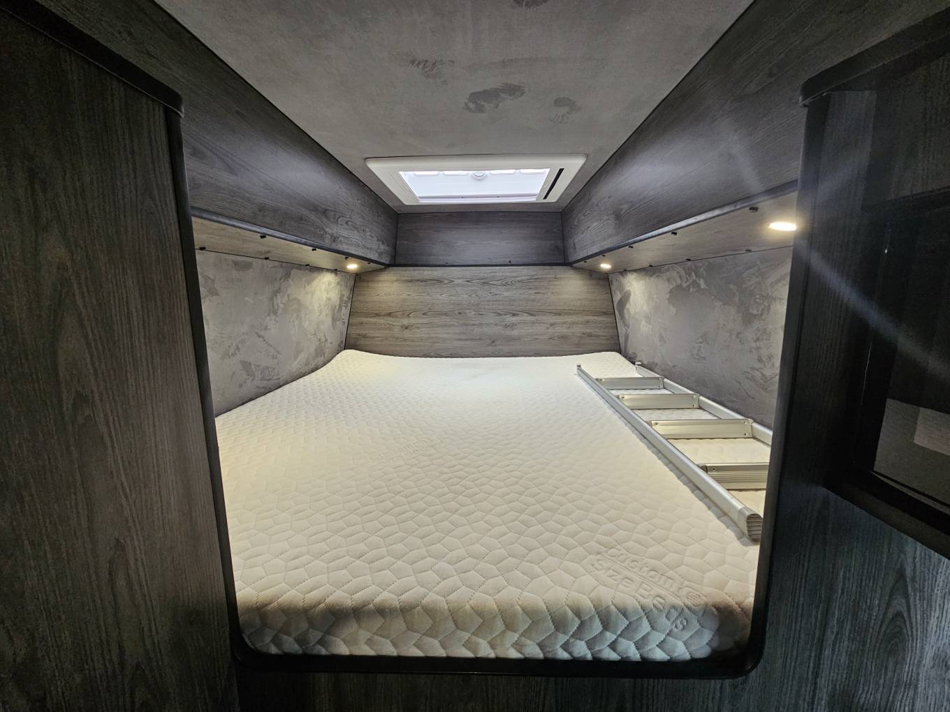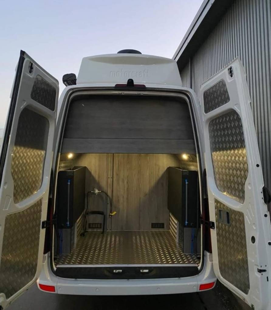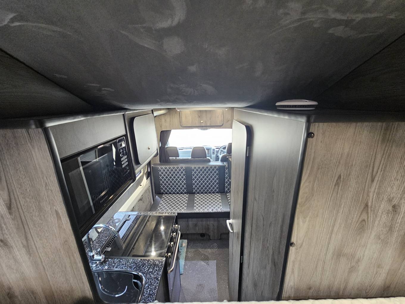 The interior is finished in Africa chestnut cabinetry with grey wall panelling, soft touch lining, black Altro flooring and black sparkle worktops. Upgraded Bentley stitch upholstery with RaceSpace logo headrests gives a cohesive, premium finish. There are two side windows with integrated blinds, two skylights with flyscreens and blinds, plus an additional roof pod skylight.
