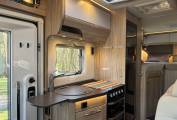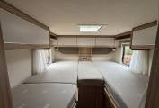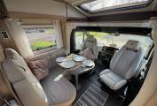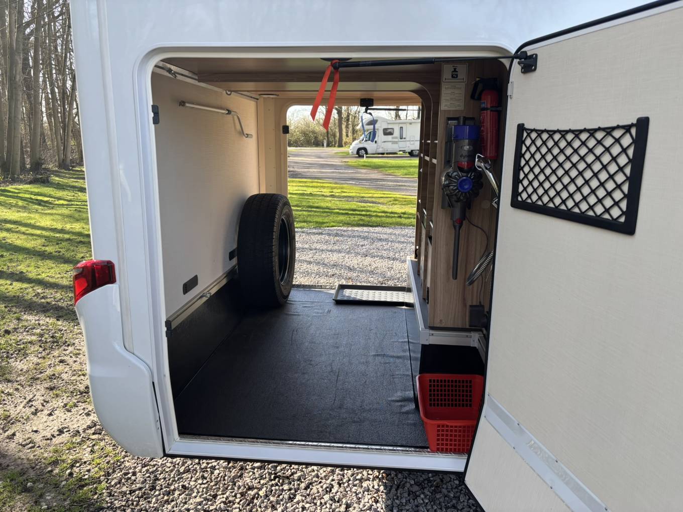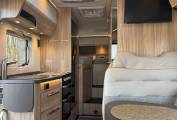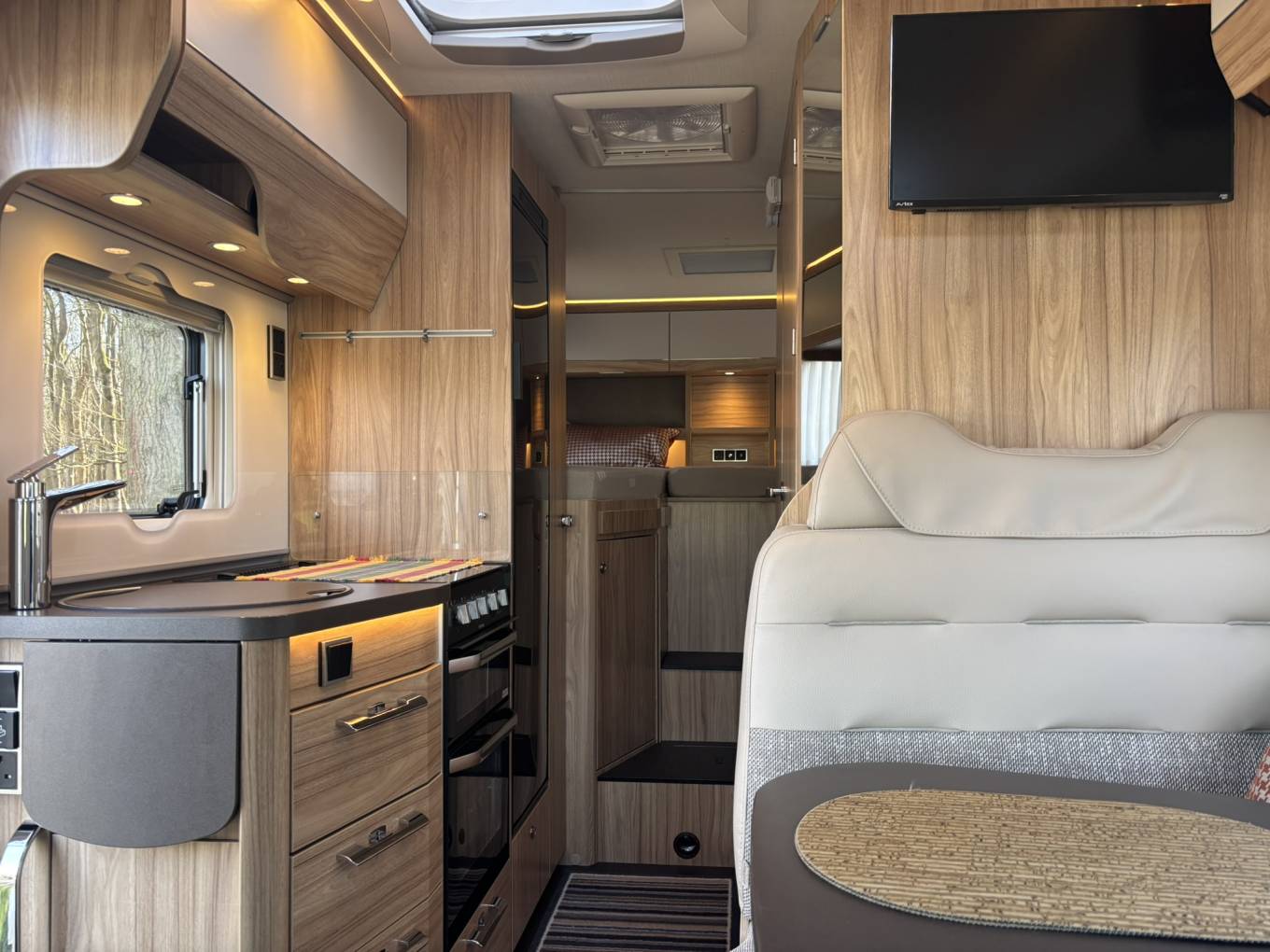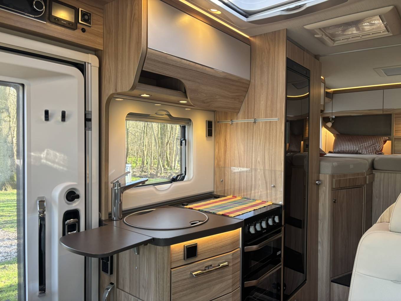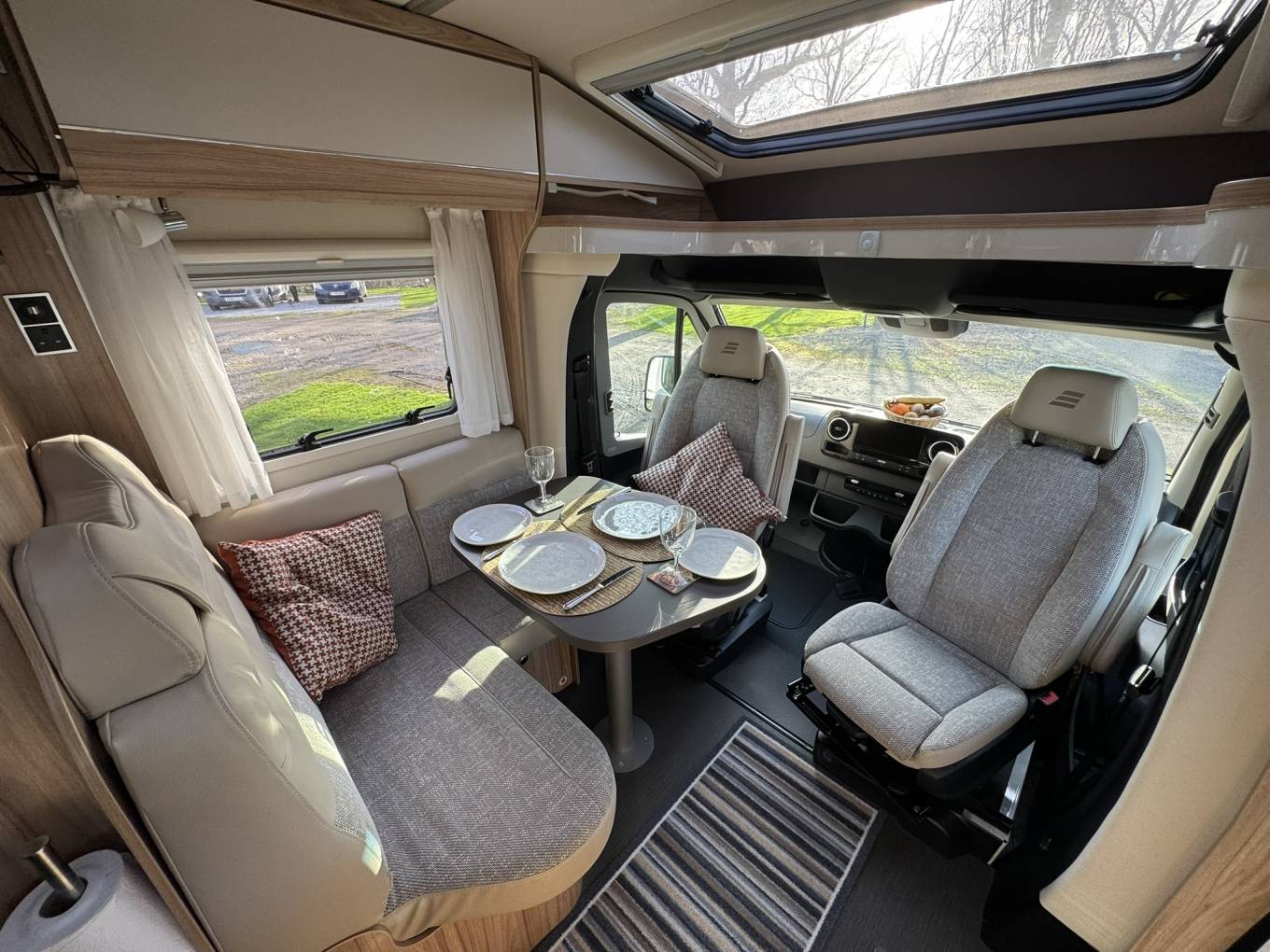 Up front, the L-shaped lounge with swivel cab seats creates a spacious and sociable living area, enhanced by the panoramic skylight above the cab that floods the interior with natural light. Externally, you will find the full sized rear garage, giving you plenty of storage options for extended touring.