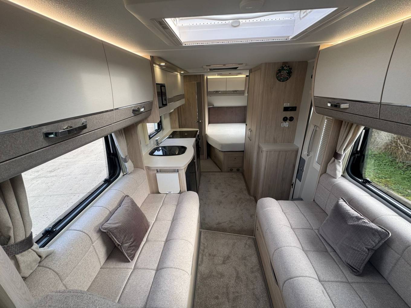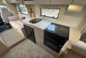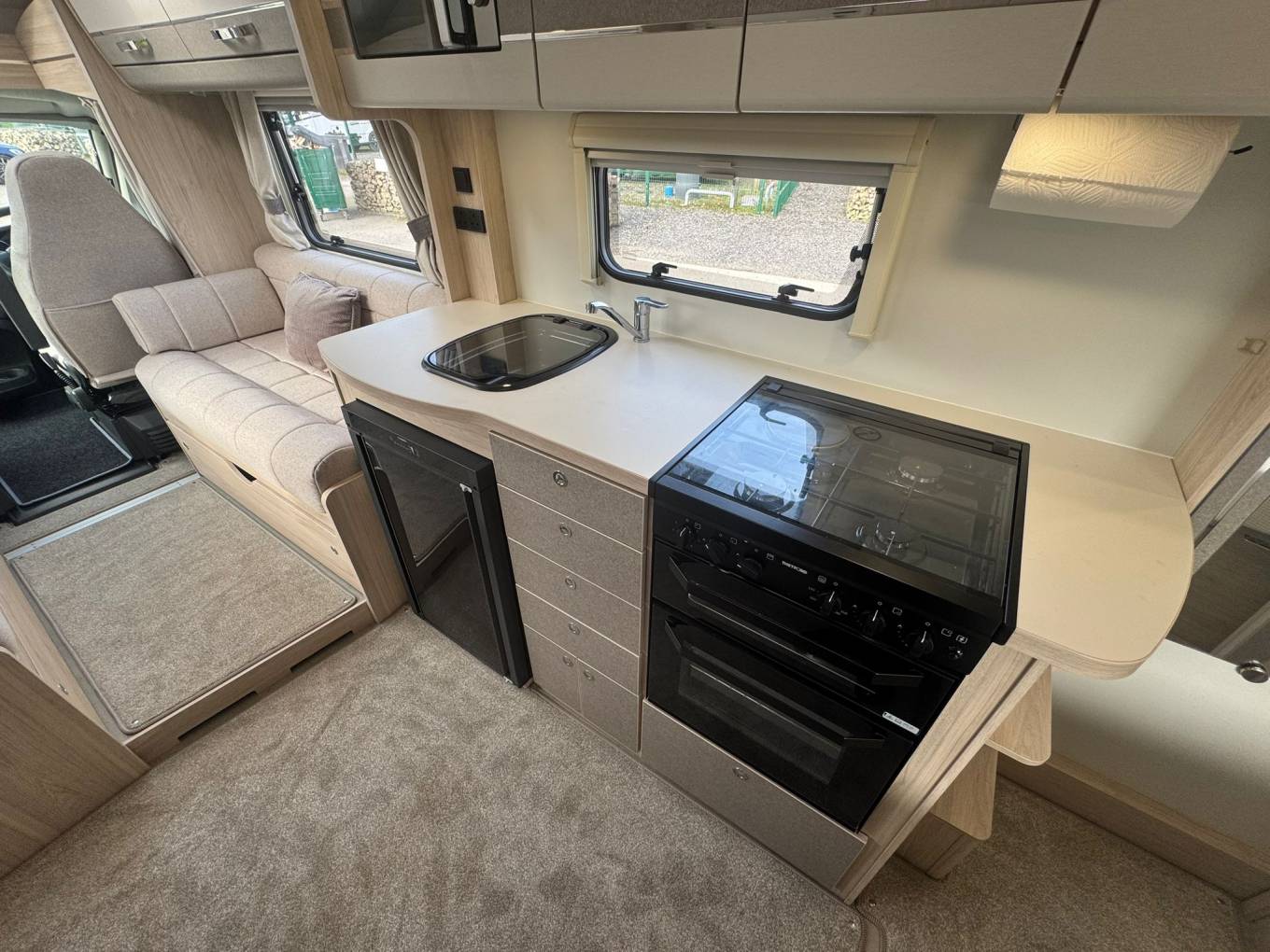 The kitchen is well equipped for touring comfort, featuring a mixer tap, under-counter fridge/freezer, three gas hob burners with one electric hotplate, oven and grill, plus a microwave. Whether you’re preparing a quick lunch or a full evening meal, everything you need is at hand.