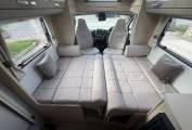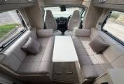 Step inside and you’re welcomed by a light, neutral interior that creates a bright and spacious feel. The cab seats swivel to open the lounge area, where you’ll find two long bench seats – perfect for relaxing or dining. This area easily converts into a double bed and provides two additional travelling seats with belts, making this a true 4 berth, 4 belt motorhome.