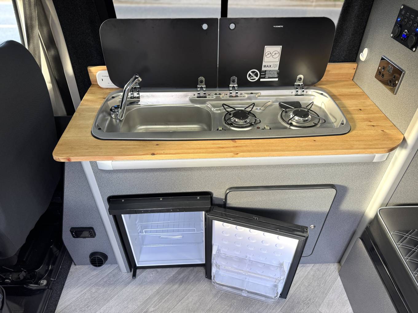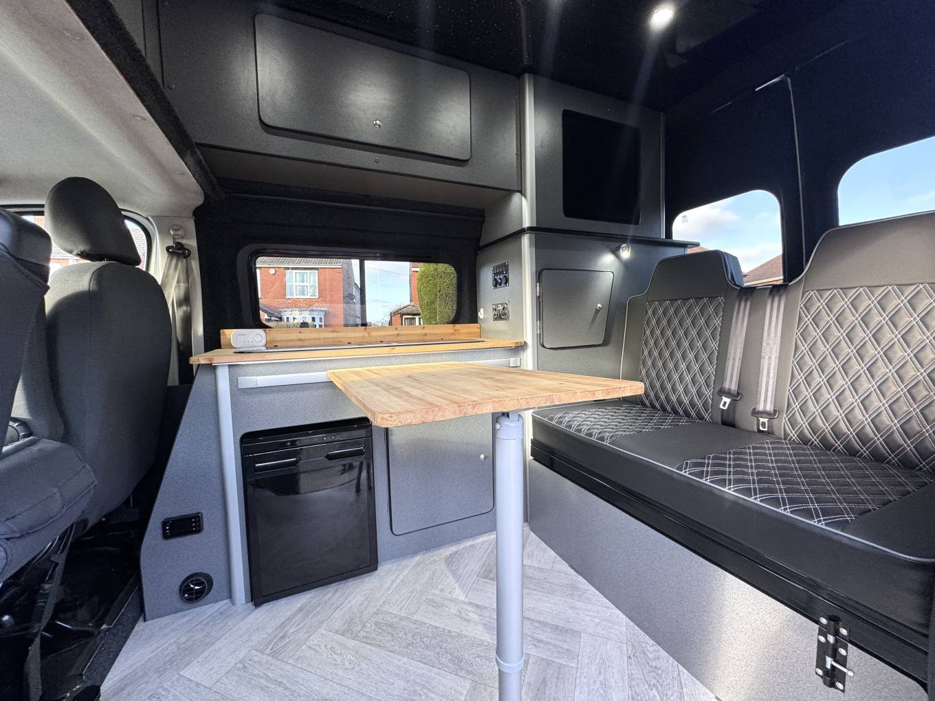 The kitchenette is fitted with a sink and two burner gas hob set into a solid wood worktop, along with a fridge below for keeping food and drinks chilled. Storage has been well considered throughout the conversion, with overhead cupboards, side cabinets and additional space beneath the seating.