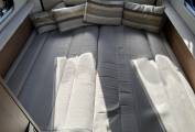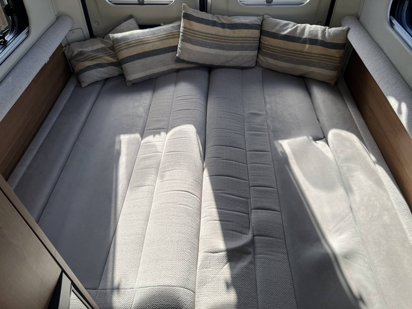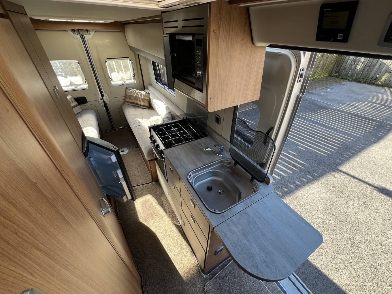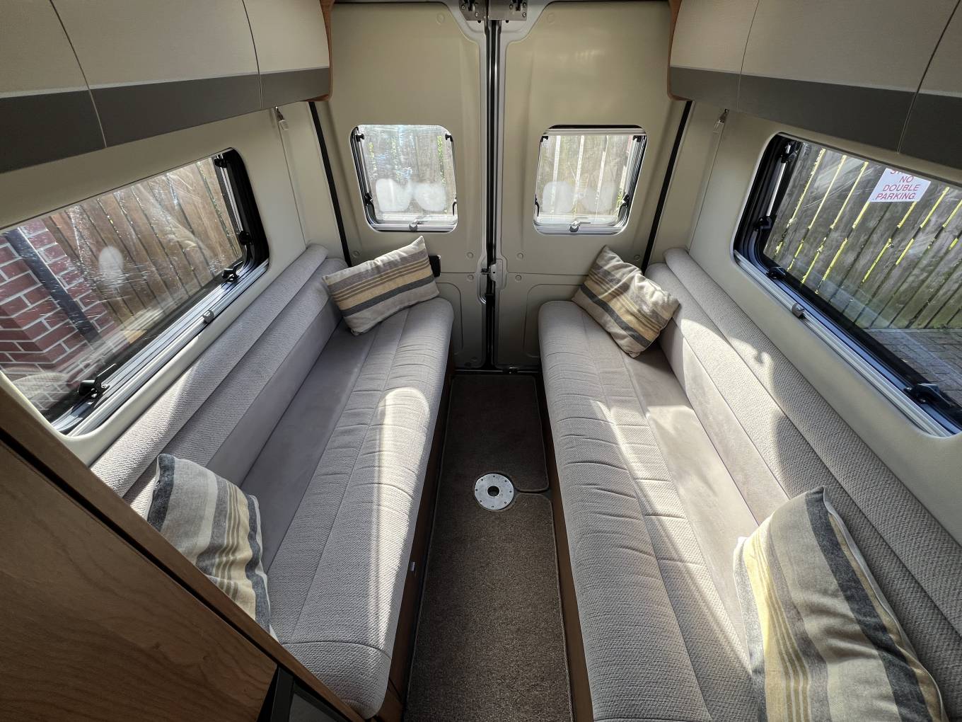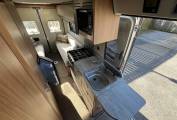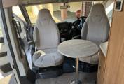The basic layout is rear lounge, with twin sofas that can be used as 2 single beds or large double, galley kitchen, with washroom opposite and 2 swivels seats up front