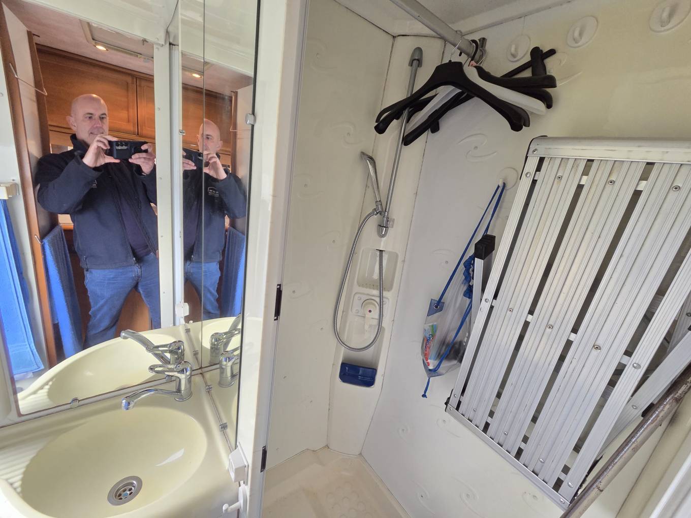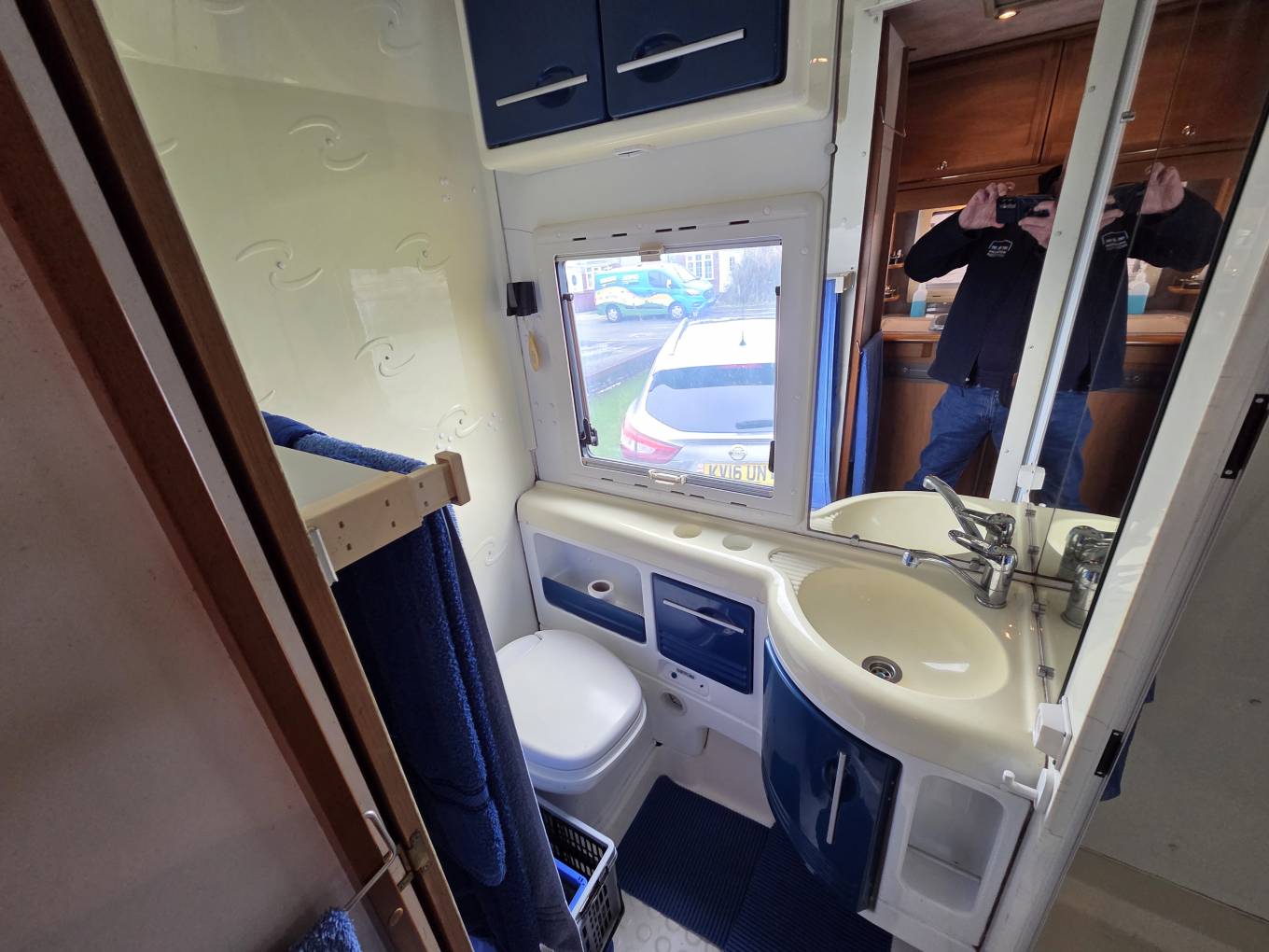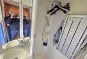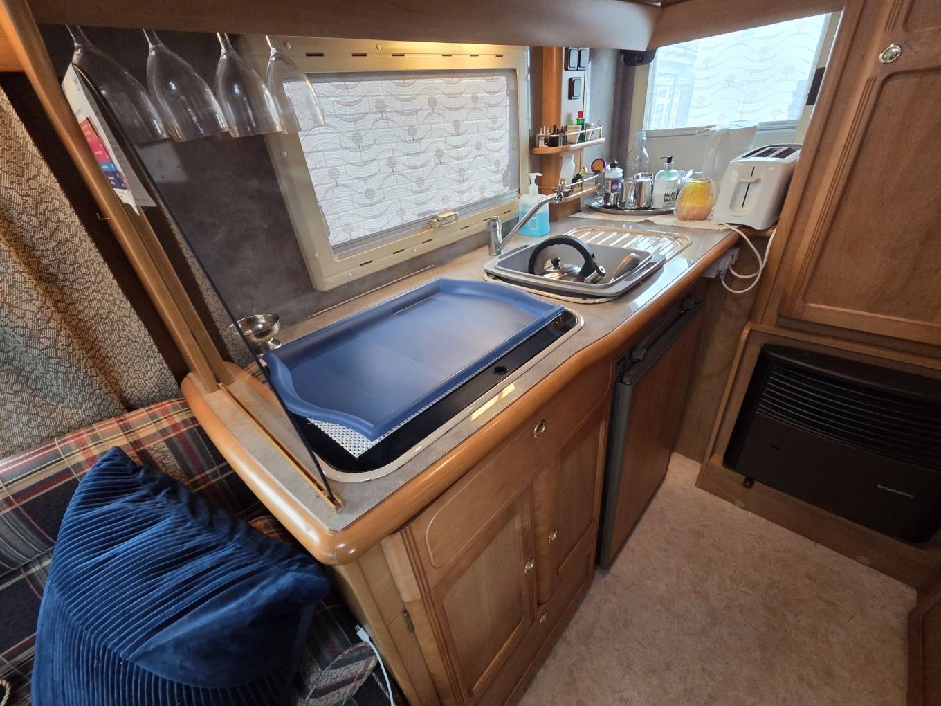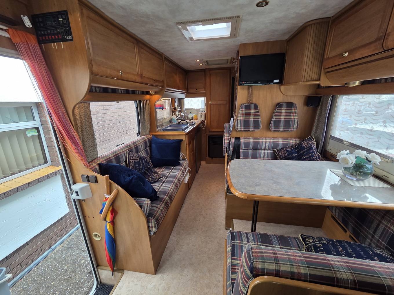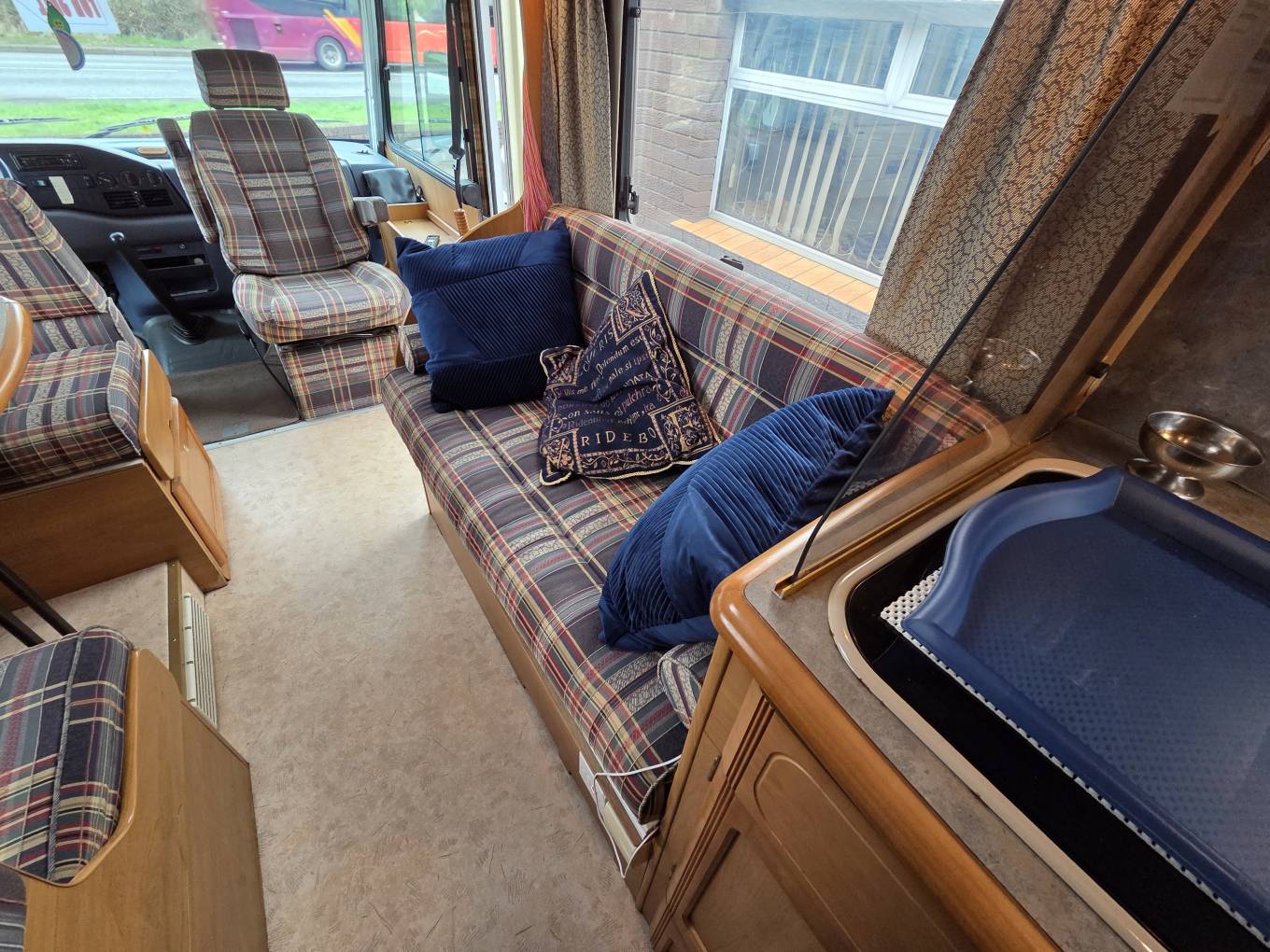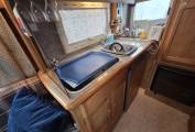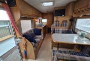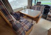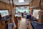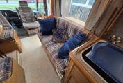 The kitchen is positioned in the offside rear corner and has 3xgas burner hob,sink and fridge.Opposite this is the very generous bathroom that includes a separate walk-in shower cubicle, a cassette toilet, and a vanity washbasin.