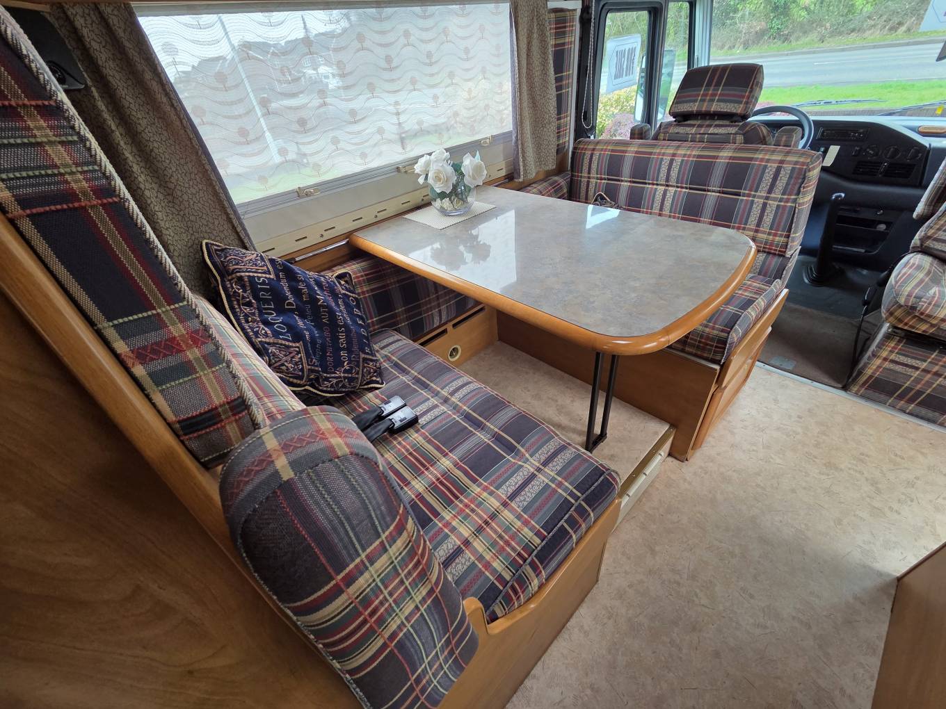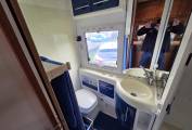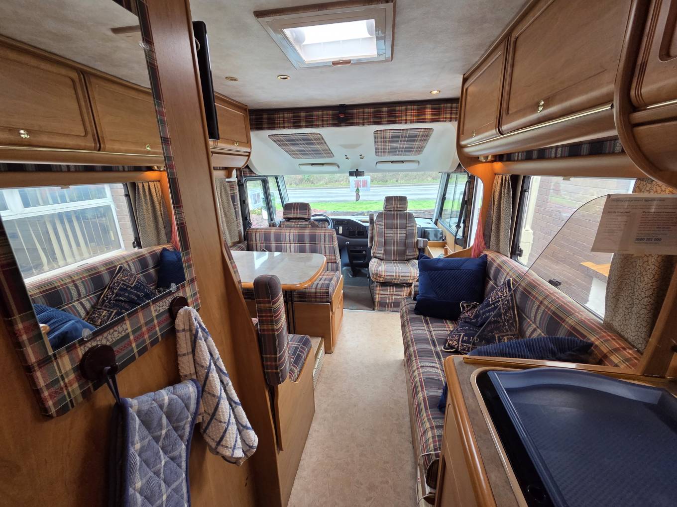 Entering the door on the driver side, you are facing the the "Pullman-style" dinette on the nearside with 2 belted seats with a short settee opposite on the offside. This is a great social and dining area with both driver seats swivelling allowing for a comfortable area for up to 6 people with this area also having a TV. This then converts into a double bed very easily and is the first two berths. The next two berths are then provided by a large manual drop-down double bed located directly over the cab area. This bed can be left ready-made and simply stows away during the day to free up the lounge.