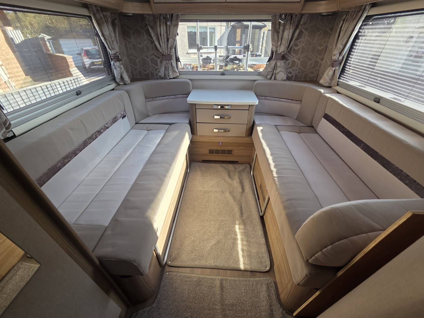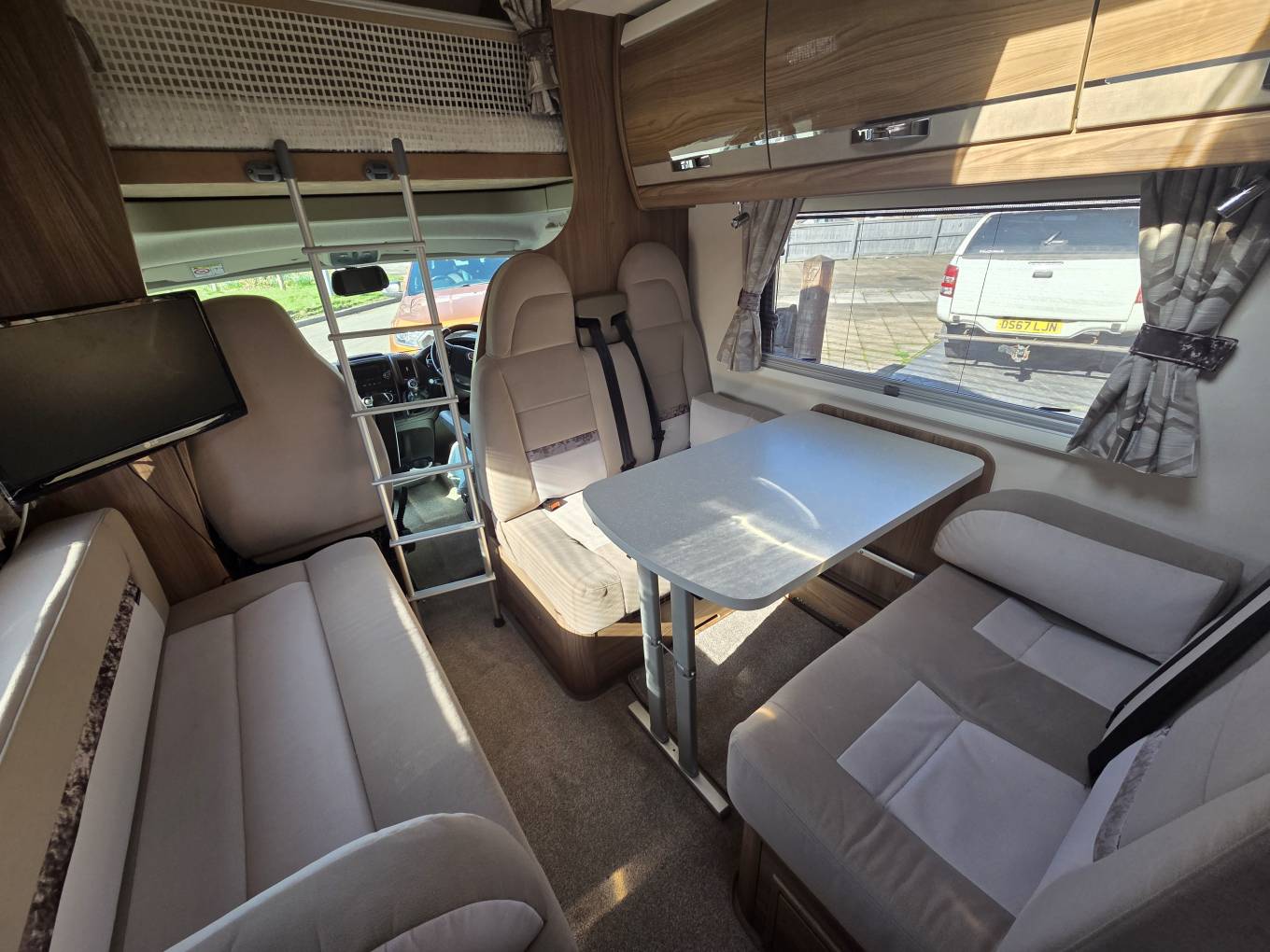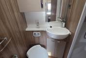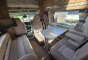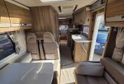 The layout consists of a front lounge/dining area with a double dinette and another 2 seater sofa opposite creating a large and spacious socialising space, in the evening this area converts easily into either a small or a large double bed and above the cab area is also another double bed.