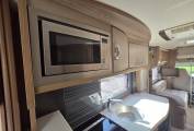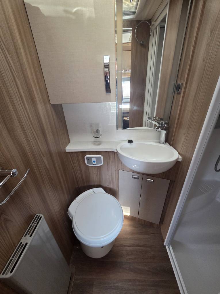 To the centre of the vehicle is the high specification kitchen with plentiful countertop and storage in abundance, which includes a 3 gas and 1 electric ring hob, stainless steel sink, separate oven and grill, extractor fan, microwave and a Dometic fridge freezer. Opposite this is the fully equipped and spacious bathroom, it has a separate shower cubicle, toilet and hand basin, vanity unit and mirror with further storage units.