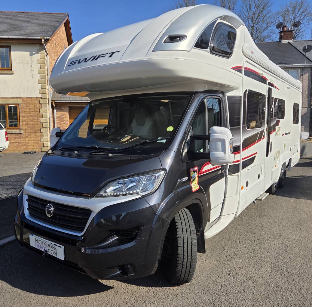 Motorhome Depot are pleased to present this superb 2016 Swift Kon-Tiki 649 Black Edition 6-berth,6-belt luxury family motorhome. Based on the Fiat Ducato, it is powered by the 3.0 turbo diesel engine and 6-speed manual gearbox.Having only covered 29000 miles, it comes with service history and an MOT until November 2026 with no advisories and will also come with a fresh Habcheck so the next owner can have complete peace of mind. It has a GVW of 5000kg with a payload of 800kg so it will require a C1 UK licence and is 8.56m long.