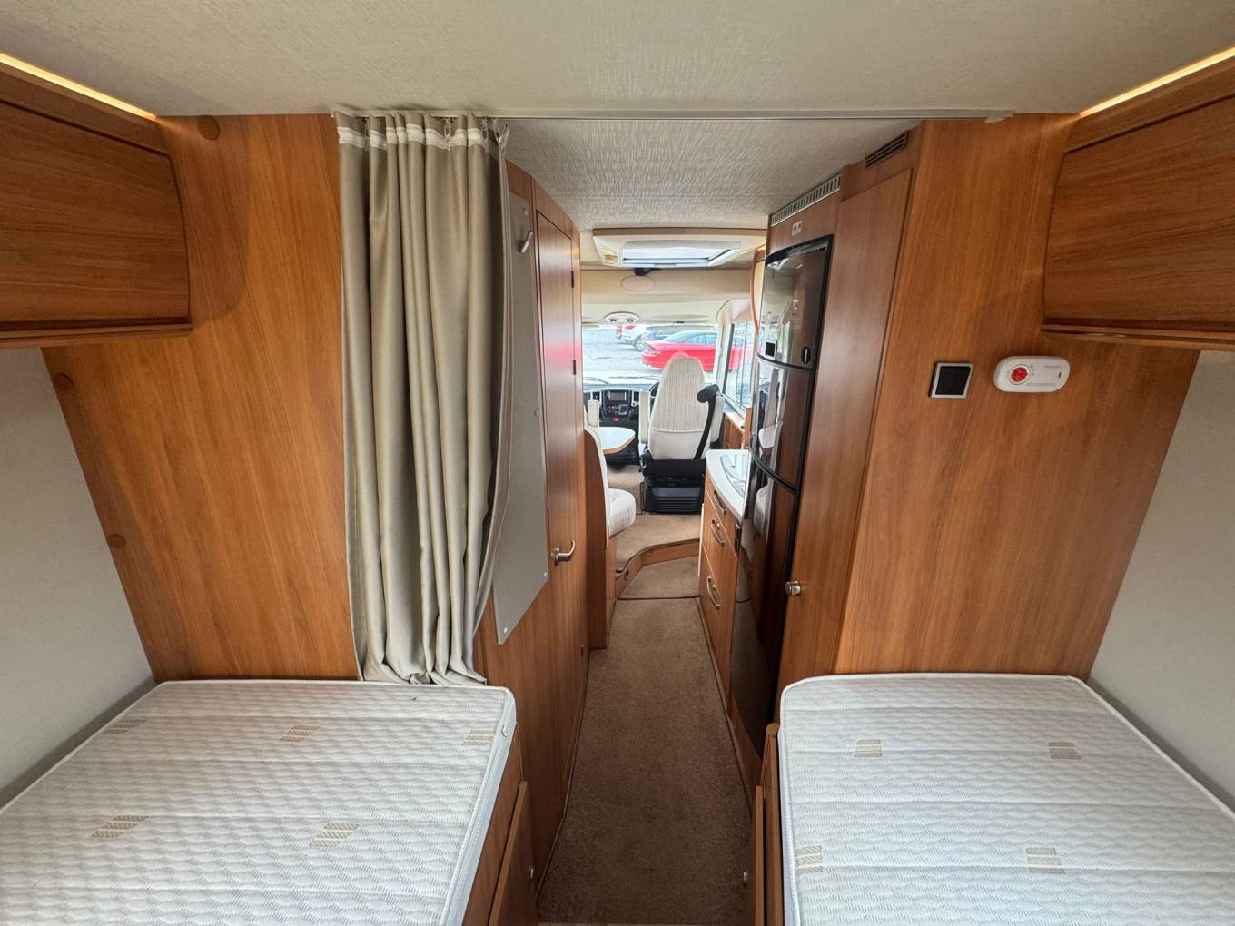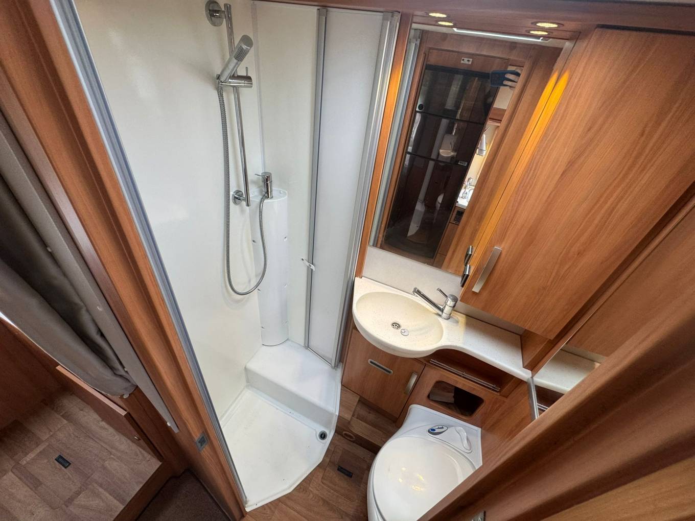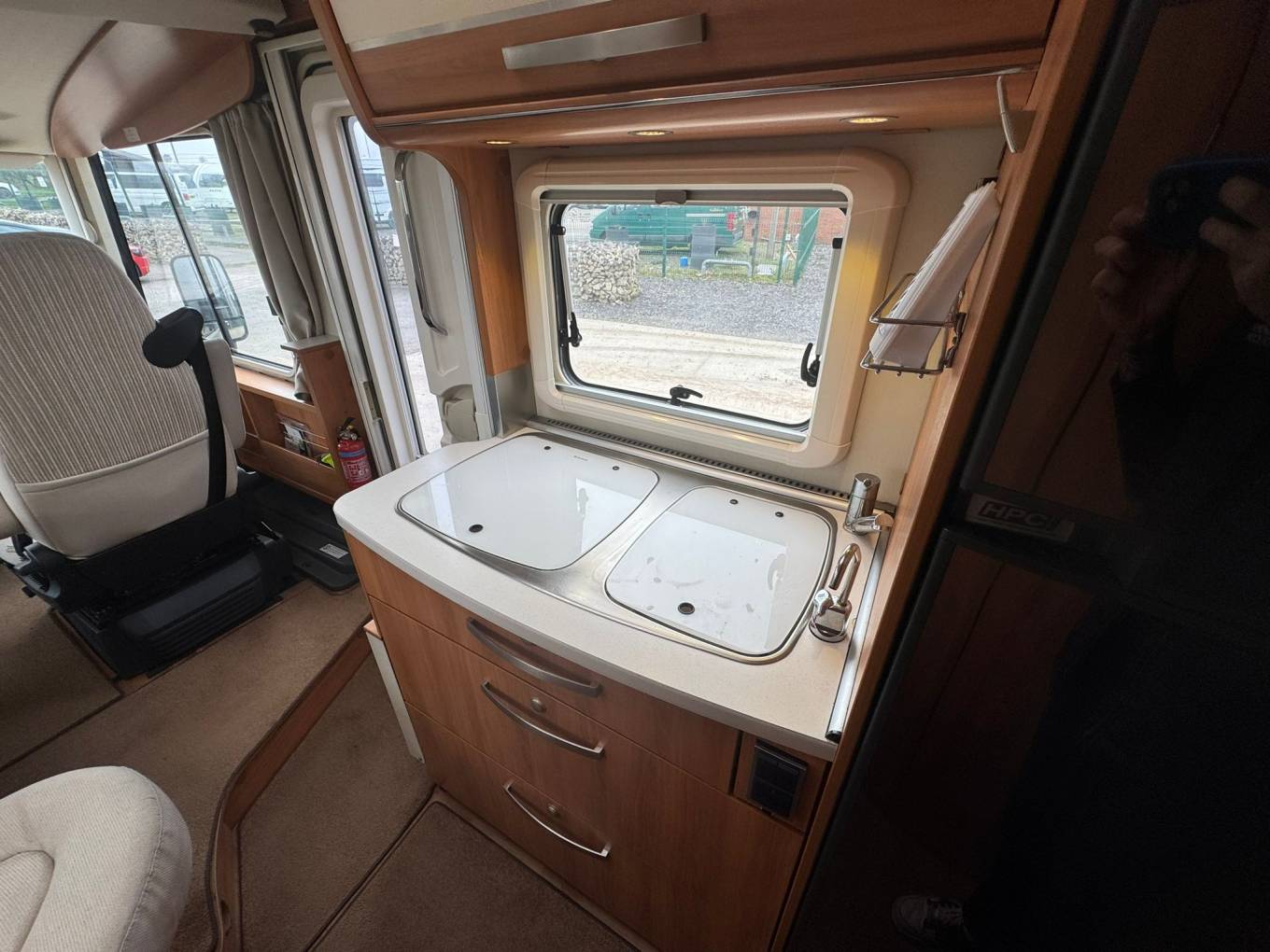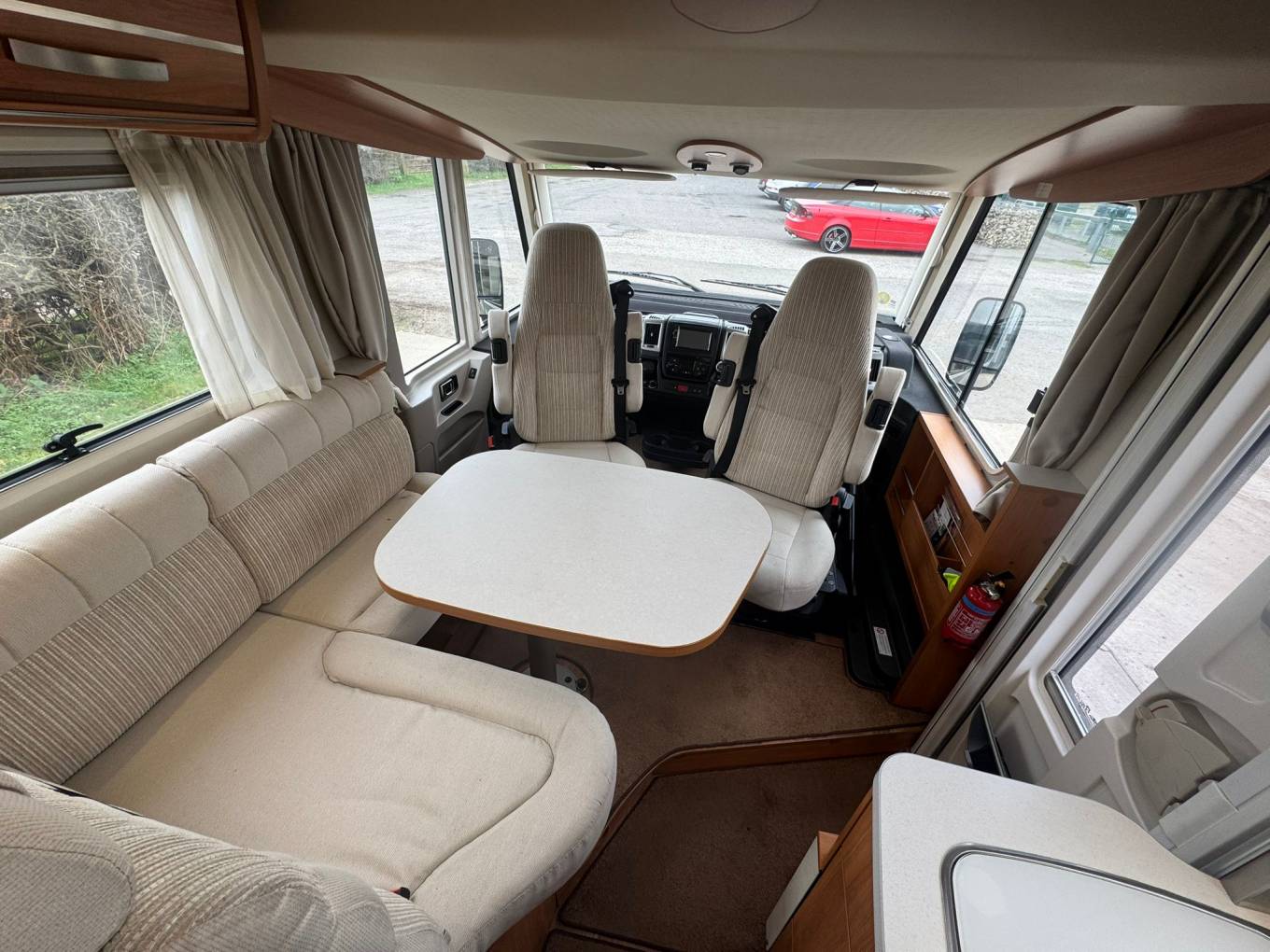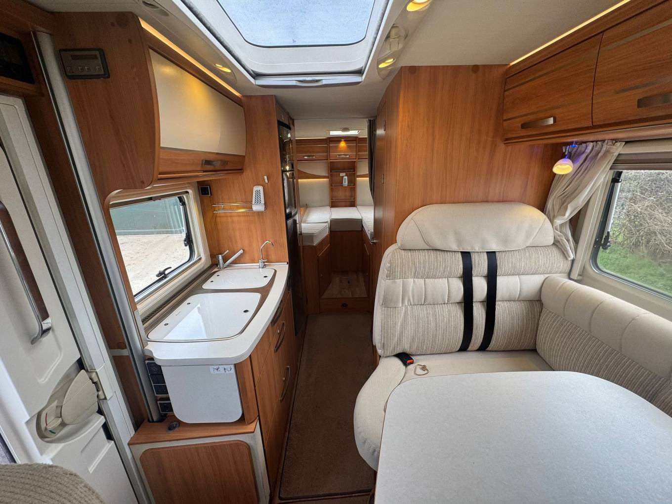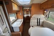 Built on a Fiat chassis with a manual gearbox and a 3500kg gross weight, this motorhome can be driven on a standard UK driving licence, making it an excellent option for both new and experienced motorhome owners. With just over 42,000 miles on the clock, it presents very well and is ready for its next adventure. As you enter the motorhome you are welcomed by a comfortable front dinette area, perfect for relaxing or enjoying meals. Both cab seats swivel to create a spacious and sociable lounge space, and a TV is included for entertainment while you unwind after a day of exploring. Above the cab is a generous double bed, providing a convenient sleeping space without needing to convert the lounge. Moving into the kitchen area, you’ll find it well equipped for life on the road. It features a sink with a kitchen mixer tap and an aftermarket water filter tap, a three-ring gas hob, grill, and a large Dometic fridge with a separate freezer compartment. Opposite the kitchen is a combined washroom with all the essentials neatly arranged to maximise space and convenience. At the rear of the motorhome are comfortable fixed single beds, which can also be converted into a large double bed if preferred. Beneath the beds is a large garage, perfect for bikes, outdoor furniture and travel equipment, with plenty of storage throughout the motorhome.