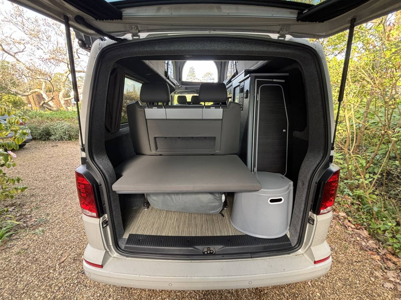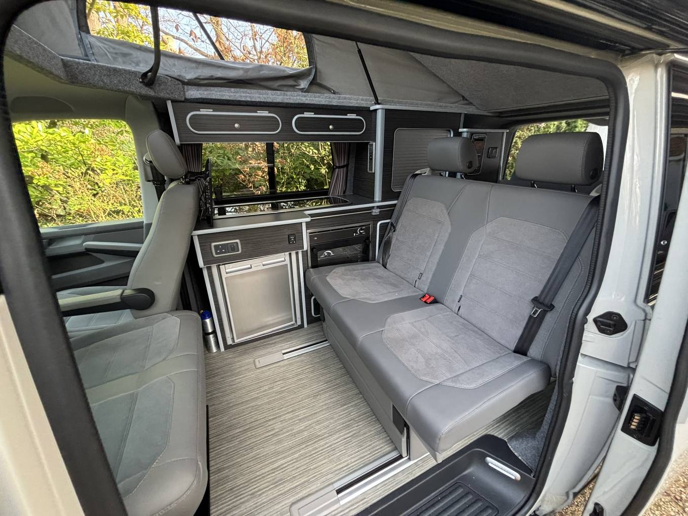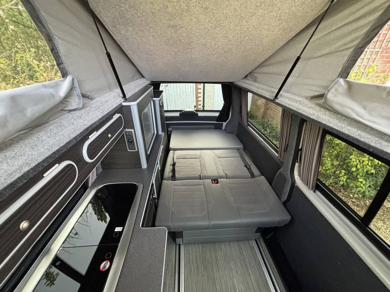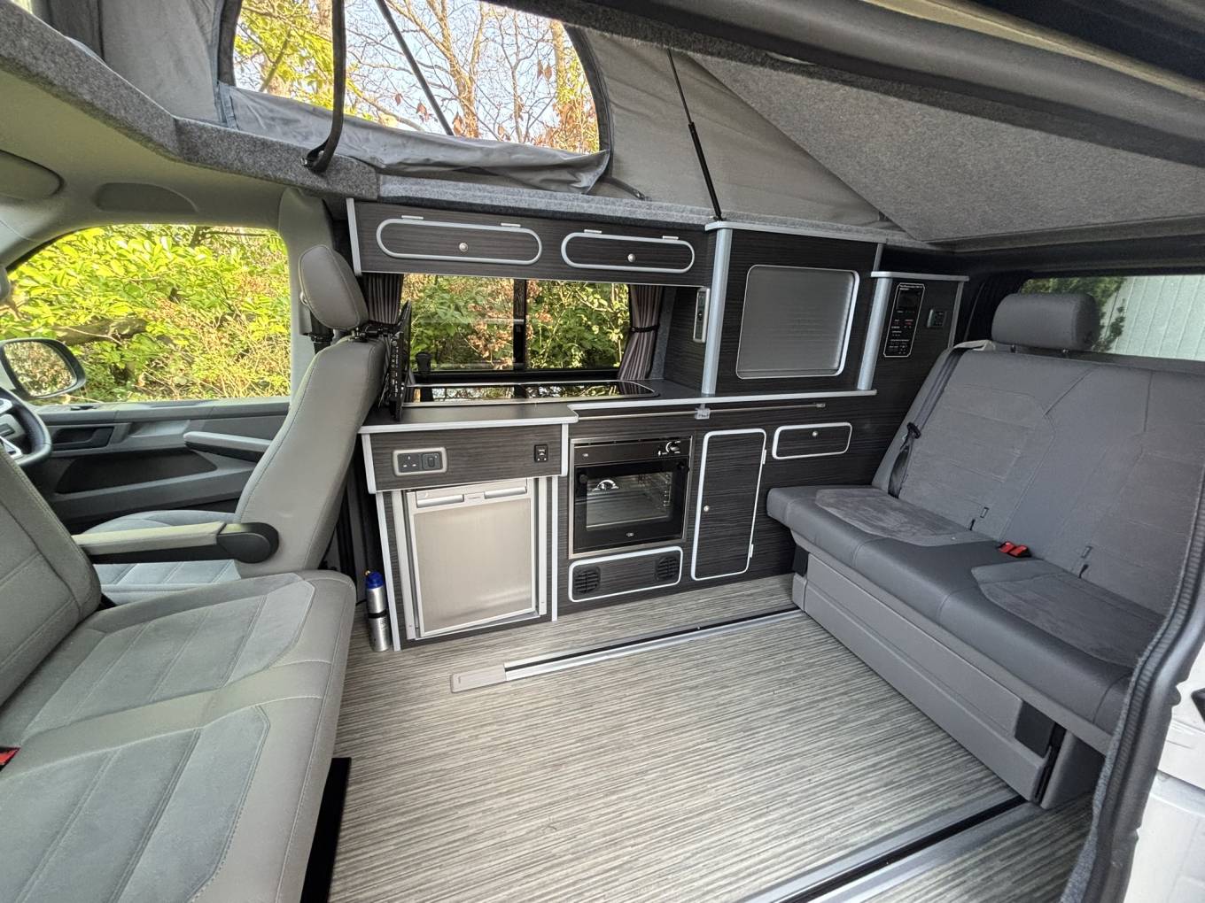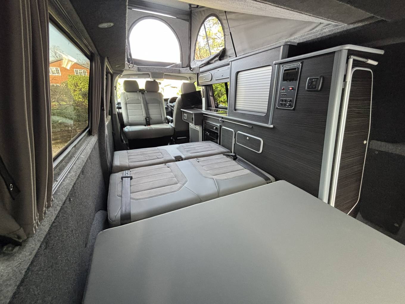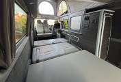 The California bed on rails provides excellent flexibility, allowing you to adjust the layout for daytime seating or night-time sleeping with ease. The addition of a diesel heater ensures the van stays warm and comfortable even in colder months.