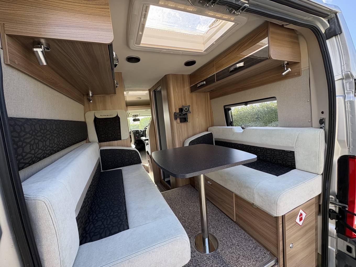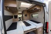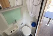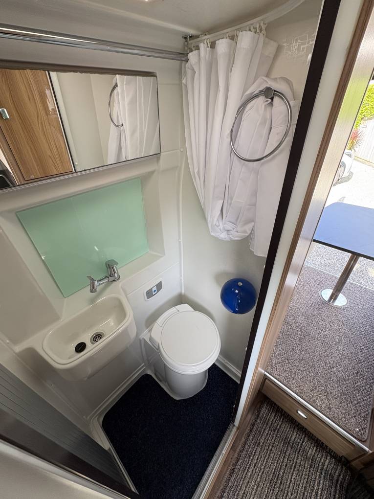 The layout comprises of a bright end lounge with two bench seats and beautiful storage lockers. This space is perfect for when you want to relax, dine or entertain, the benches also make up into a double bed and measures 6 foot by 4.5 foot, you will also benefit from a TV bracket with an aerial. In Summer you will be able to sit in this area and have the large rear doors wide open to take in the views whilst relaxing or getting ready for a day of adventure. Infront of this area you have plenty or storage space, with a large wardrobe and cupboards. Moving forward you have a modern, light washroom with toilet, vanity mirror and sink unit.