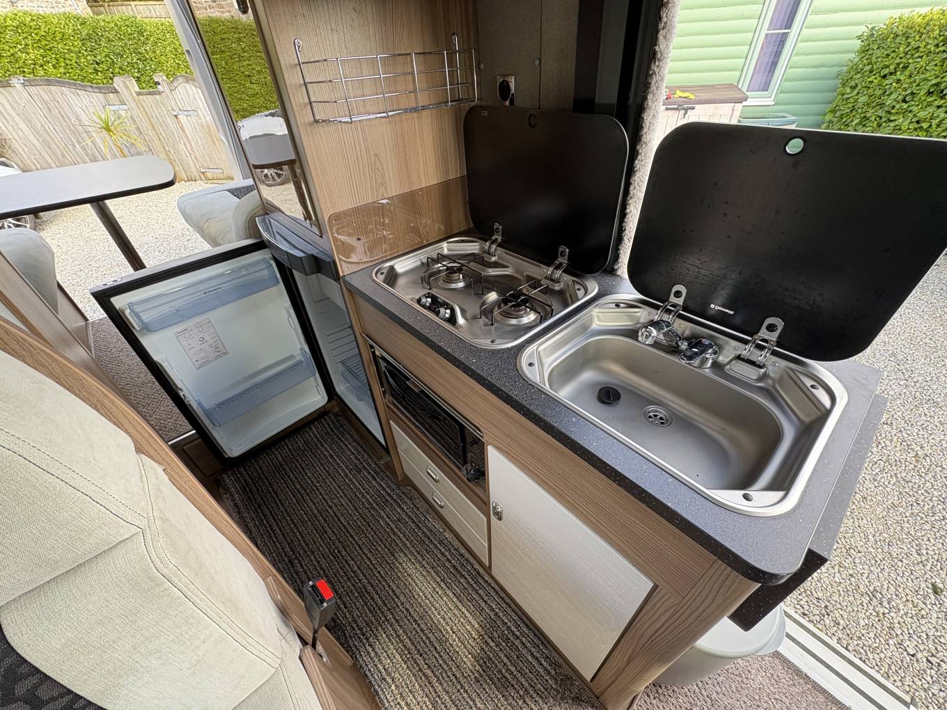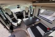 Opposite you have a well equipped kitchen which comprises of a well sized 3 way fridge/freezer, 2xgas hobs, grill, kenwood microwave, hot and cold sink and extendable worktop space with surrounding storage units that are all in really lovely condition and open and close with ease. Towards the front of the van you have a centre dinette which can accommodate an extra 2 people for travelling and when the driver and passenger swivel chairs are turned a perfect second area to relax in. This area also makes a small single bed. One thing you will notice about this model is the stunning lighting around the camper.