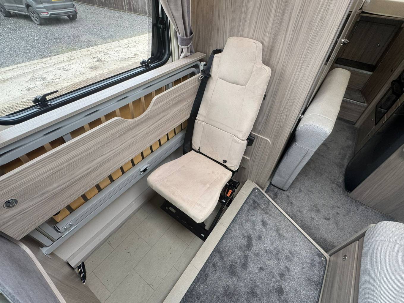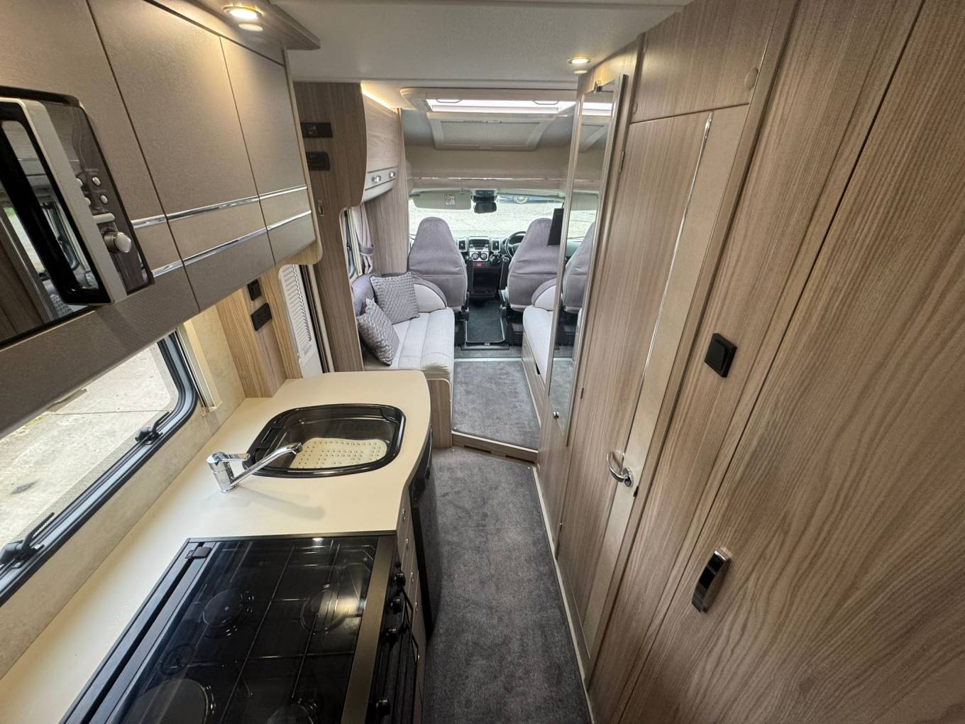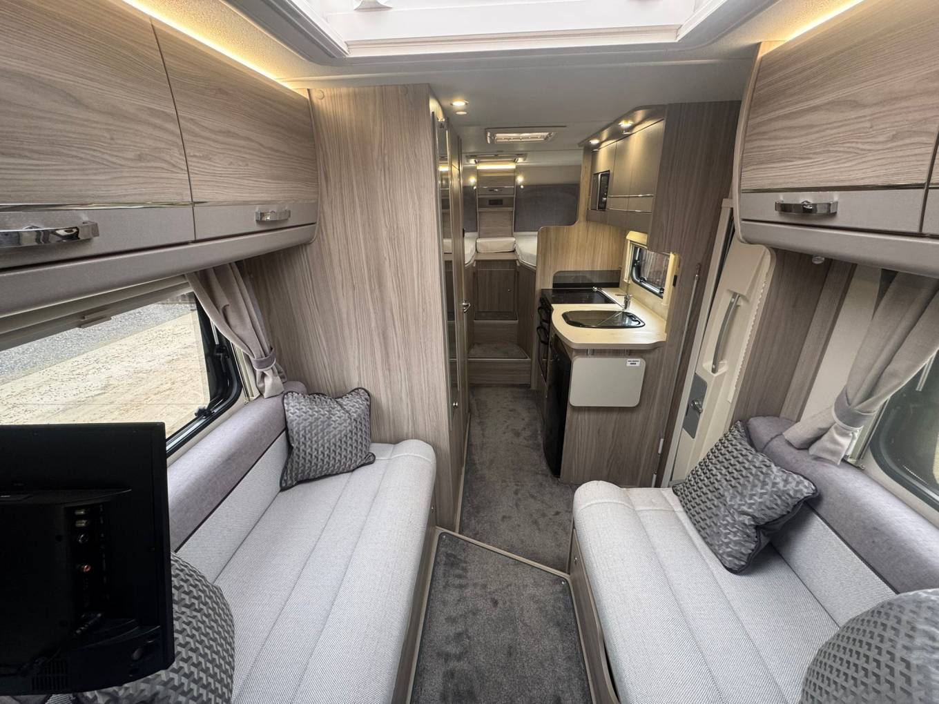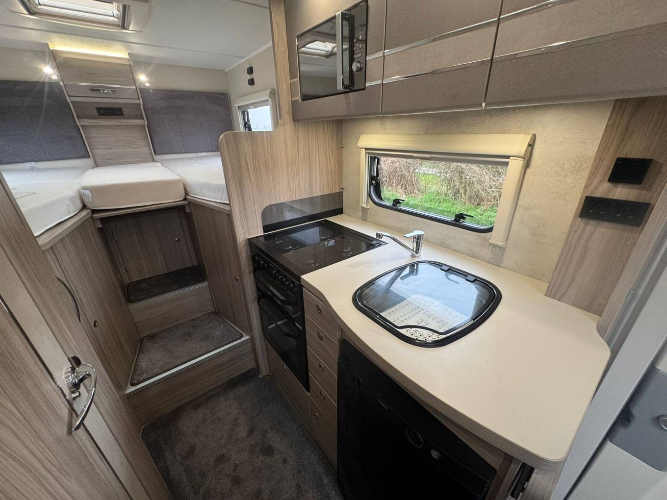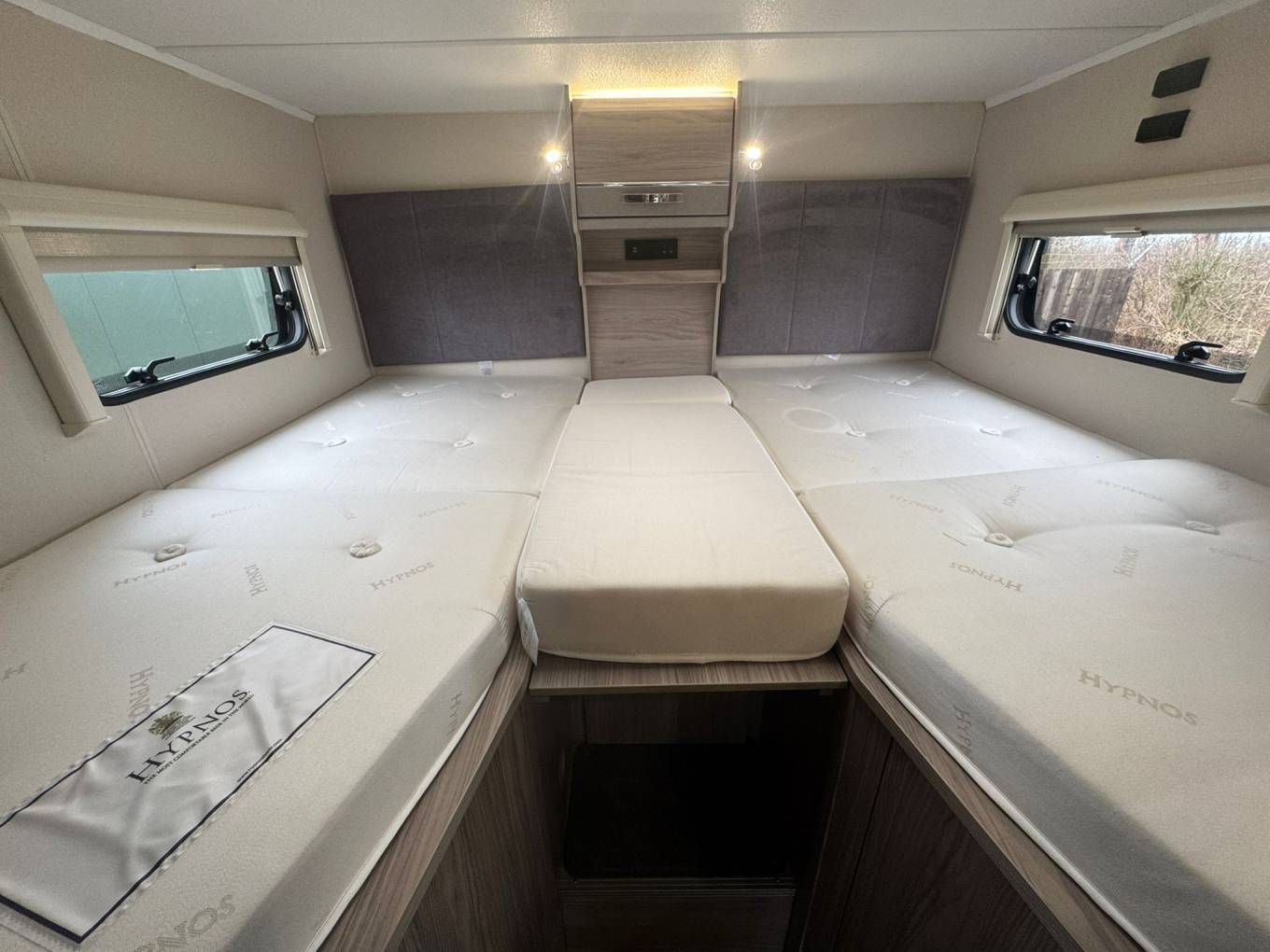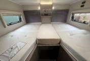 The rear sleeping area features raised twin single beds which can be used individually or converted into a generous double, with a large garage storage area beneath accessible from outside. The front lounge provides a bright and sociable seating space for four and converts into an additional double bed if required.