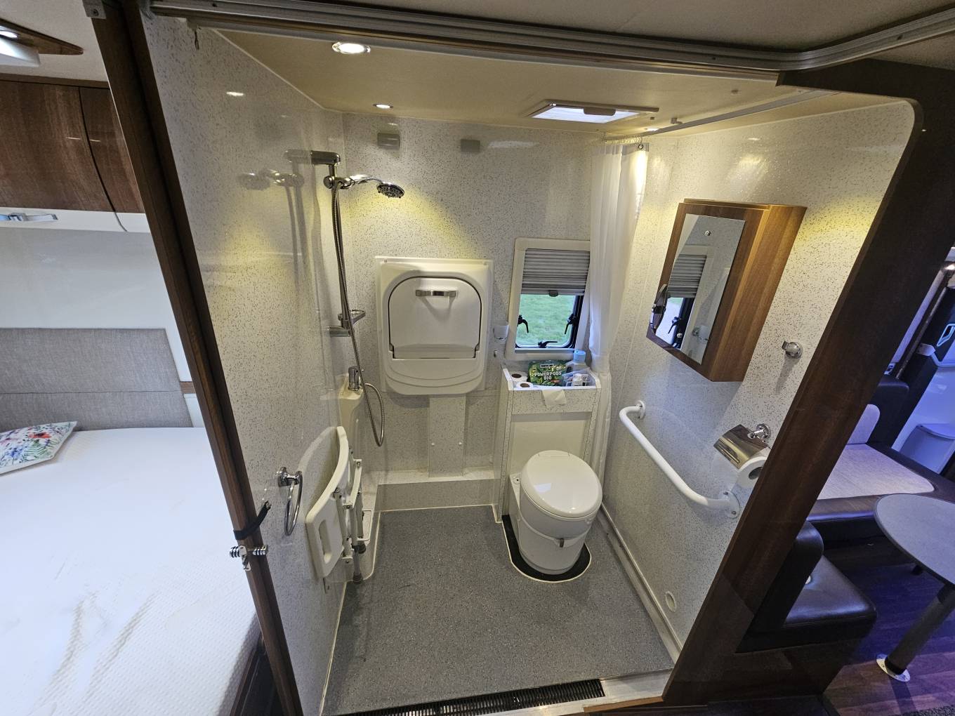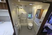 The vehicle has been professionally adapted for disability use and includes a remote operated electric wheelchair lift for easy access into the habitation area. The cab has adapted hand driving controls, and the bathroom has been modified to provide a larger wheelchair friendly layout with supportive grab rails and improved access.