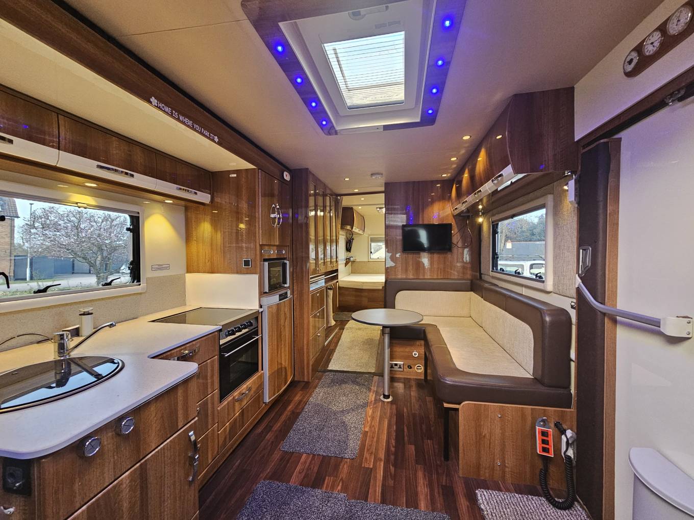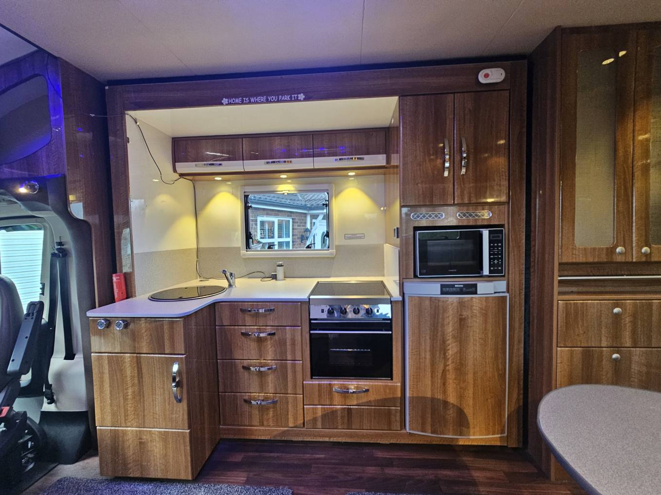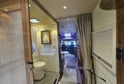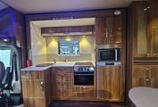 A key feature of this vehicle is the electric slide-out section, which expands the living area when parked. This significantly increases internal space around the lounge and dining area and makes moving around inside the motorhome much easier, particularly beneficial for wheelchair accessibility.