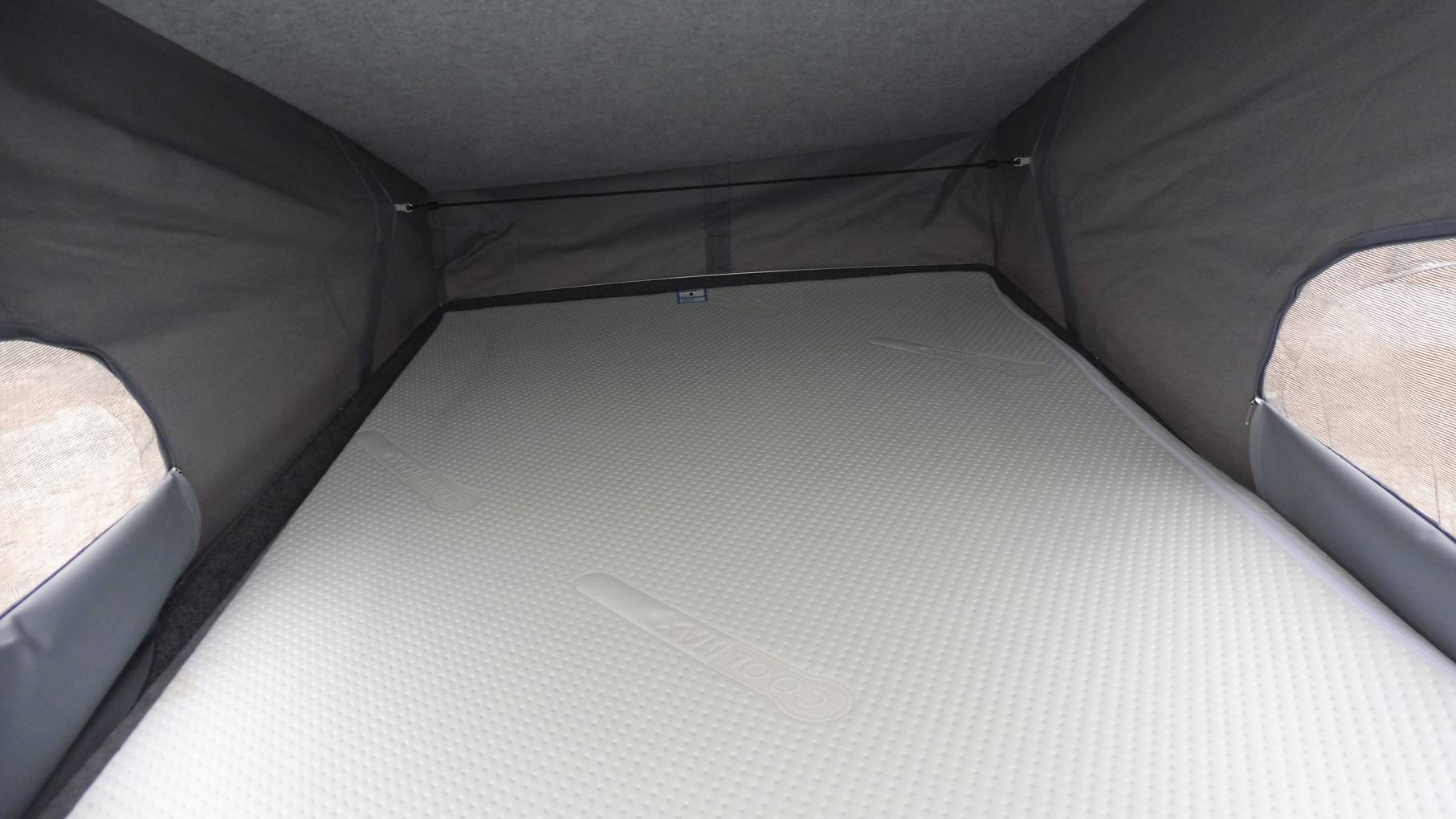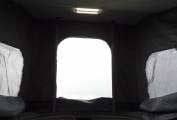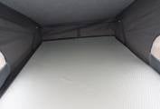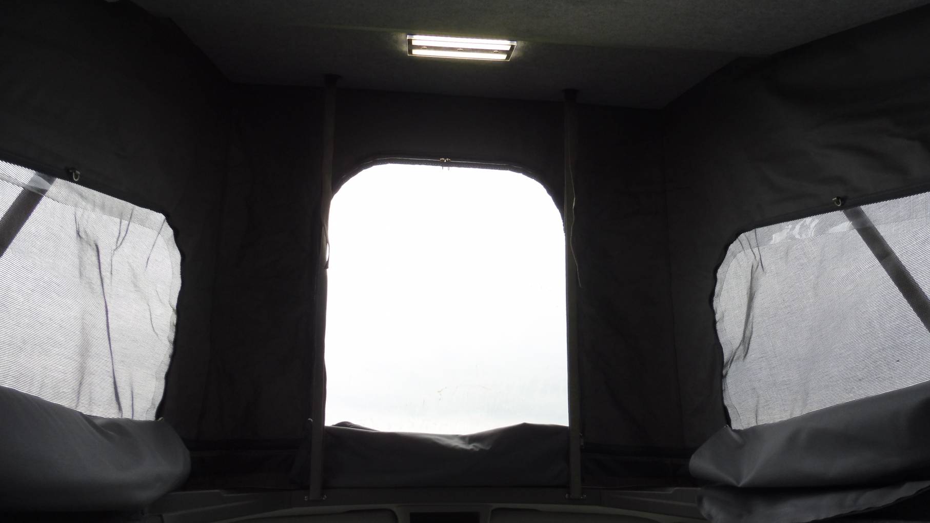 There is a second sleeping area in the pop-top roof which comes with a mattress and has a large front window, along with two side openings with fly screens or the whole canvas can be rolled up to really bring the outside in.