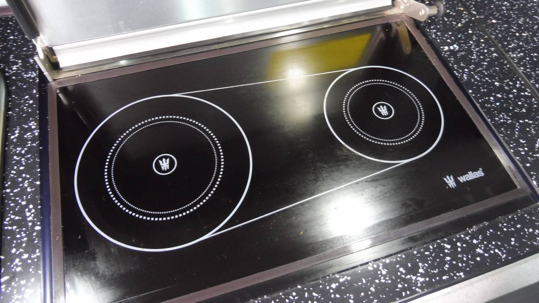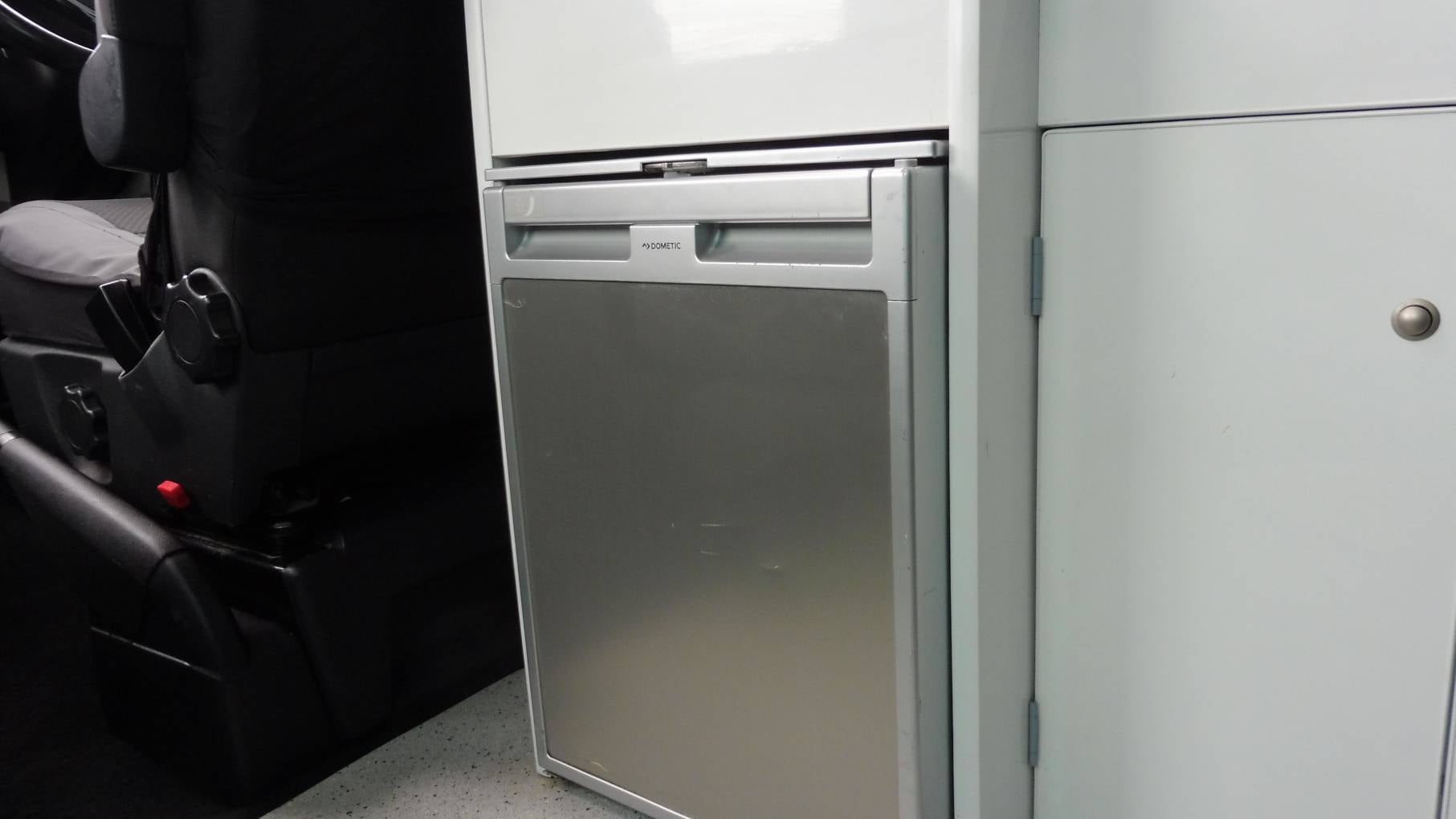 The kitchen is fitted with a Wallas twin hob running off diesel, which doubles as a blown-air heater when the lid is lowered. Built into the side unit is an abundance of storage along with Dometic compressor fridge and stainless sink with tap.
