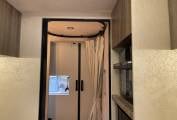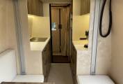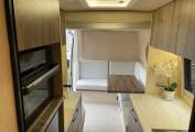 The living space is particularly generous. There is a comfortable L-shaped lounge area with an adjustable and removable table, creating a great space for relaxing or dining. Above this sits an electric drop-down bed which neatly tucks away into the ceiling when not in use, leaving plenty of open living space during the day.