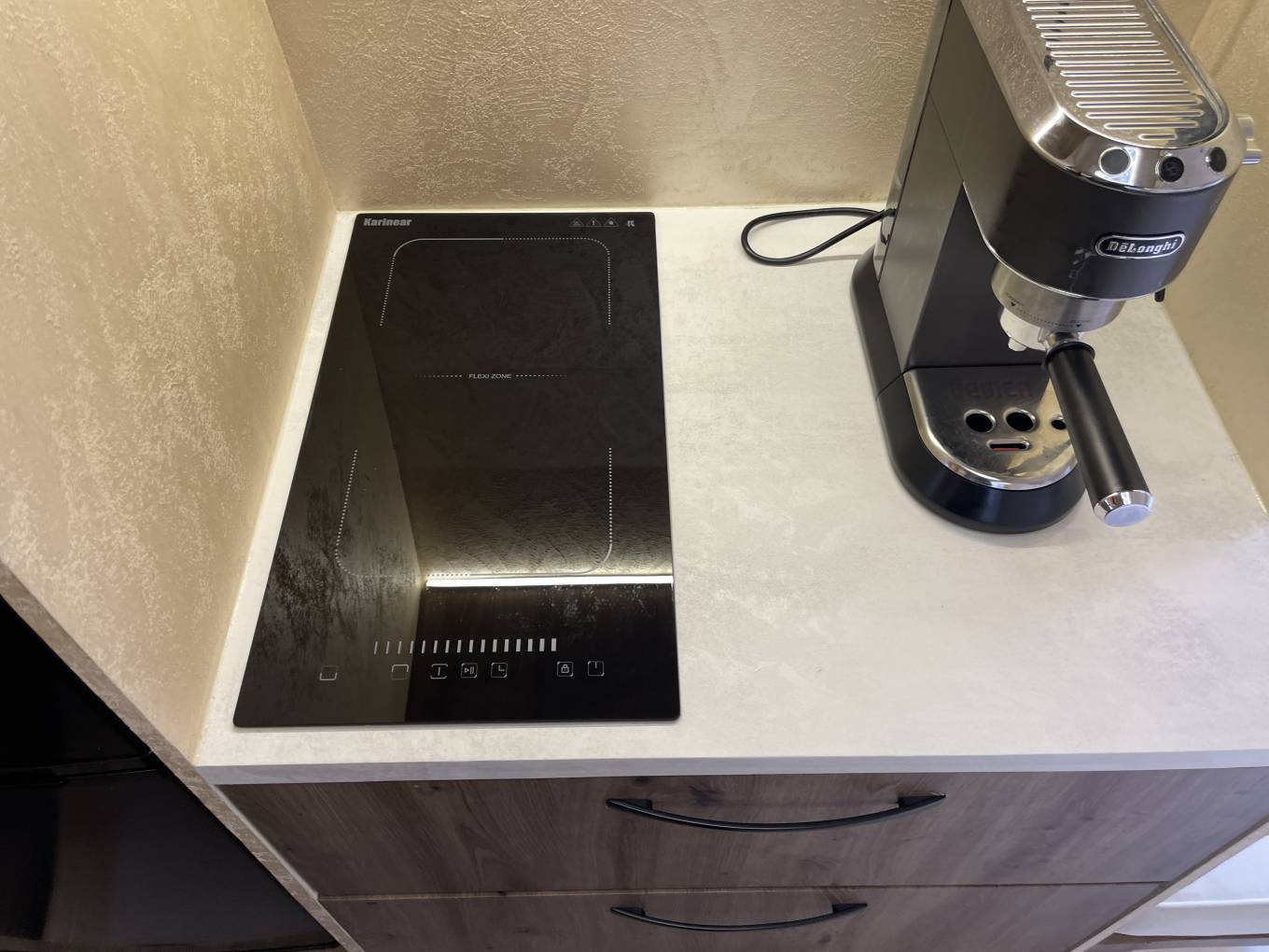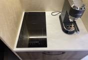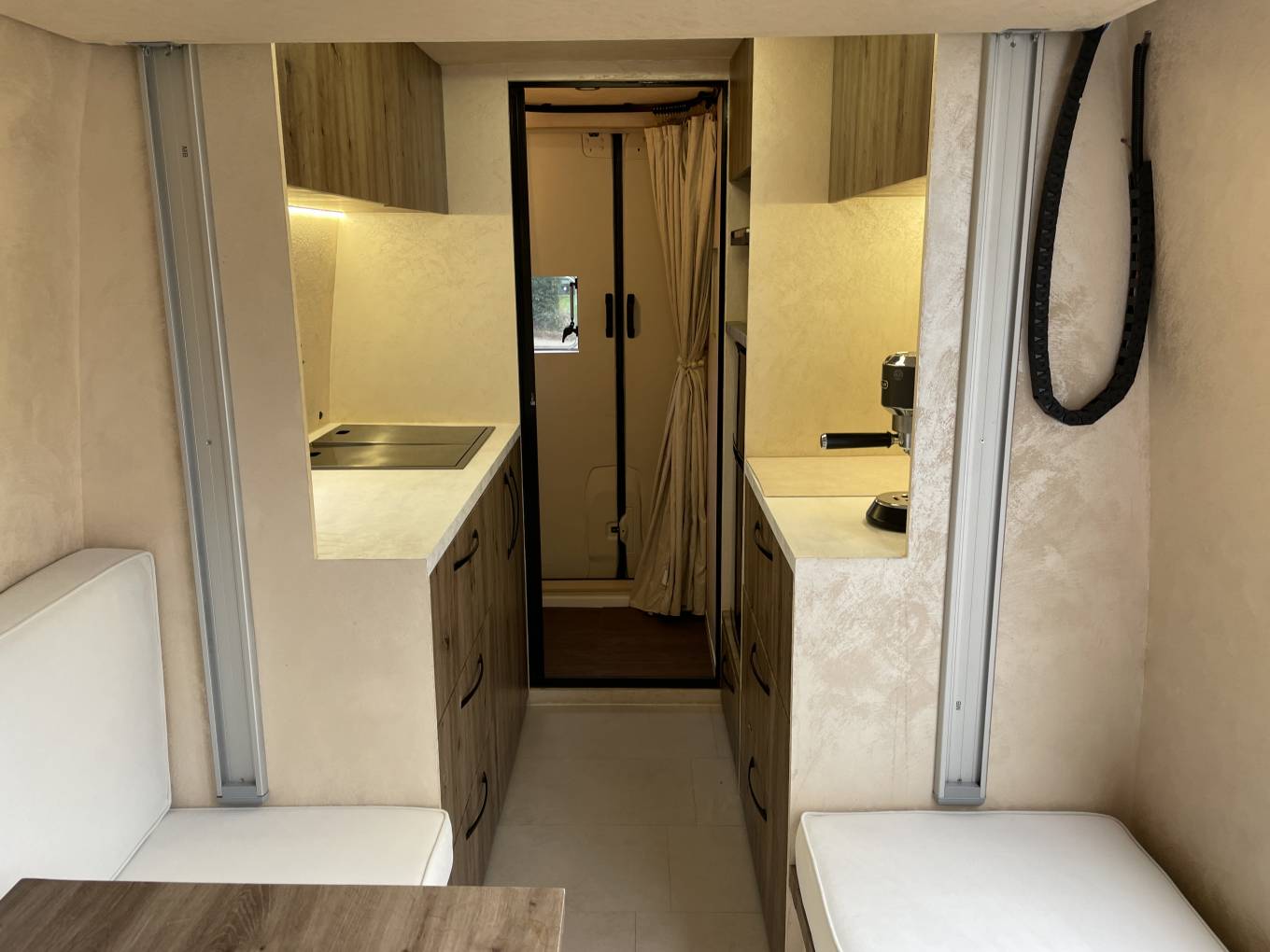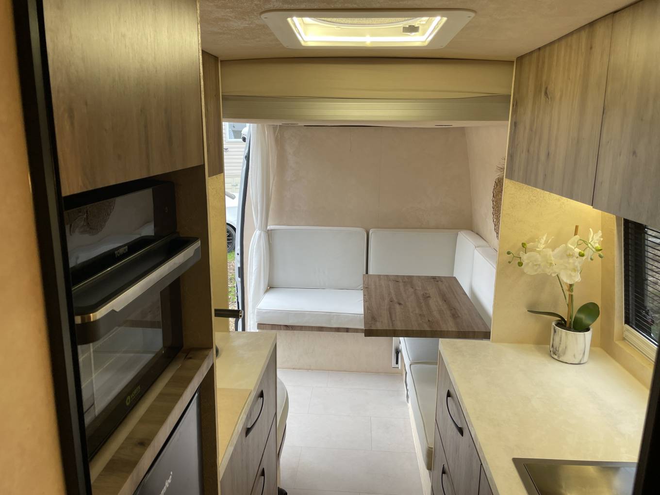 The kitchen area is equally well equipped, featuring an induction hob, fridge, freezer, and a large sink, along with plenty of preparation space. It provides everything you need to cook and prepare meals wherever you choose to park up.