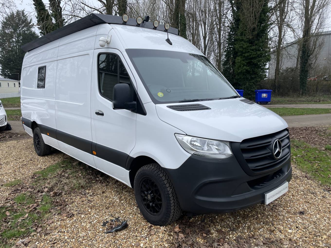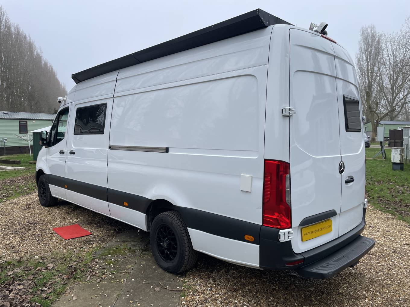It is based on a long wheelbase Mercedes Sprinter 315, measuring just under 7 metres in length (6.967m). The van is powered by a 150bhp engine paired with a 6-speed manual gearbox and sits on Rogue alloy wheels fitted with AT3 tyres. For added comfort on the road, it also benefits from rear air suspension, providing a smooth and stable ride.