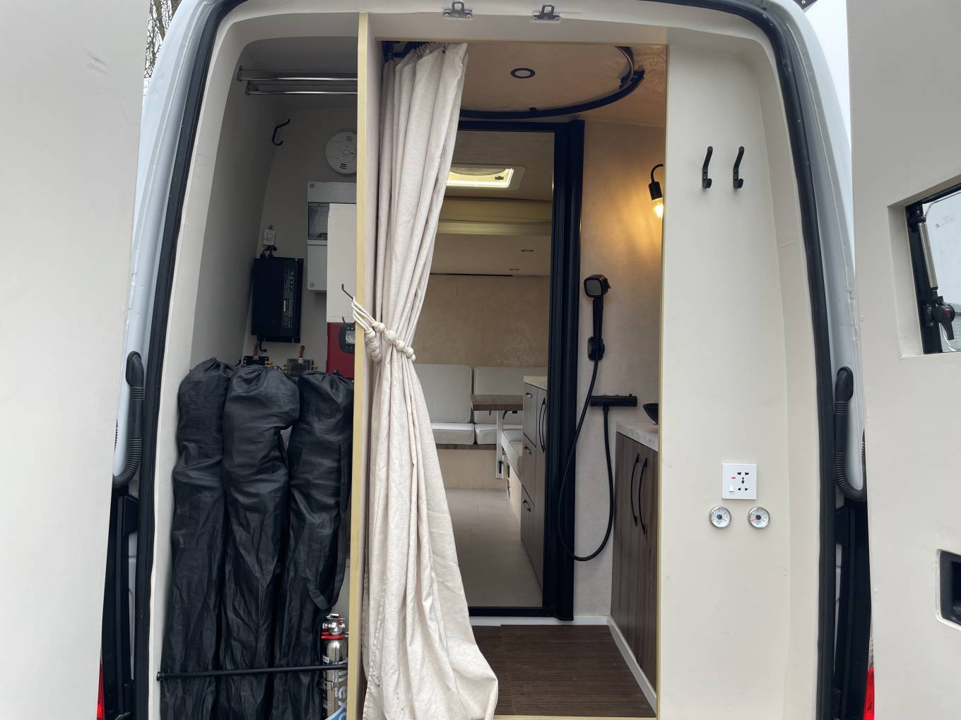 For comfort and self-sufficiency on the road, the van features a 105L fresh water tank and a 65L grey waste tank. It also includes full bathroom facilities with a 15L electric water heater, a water-saving shower, and a composting toilet.