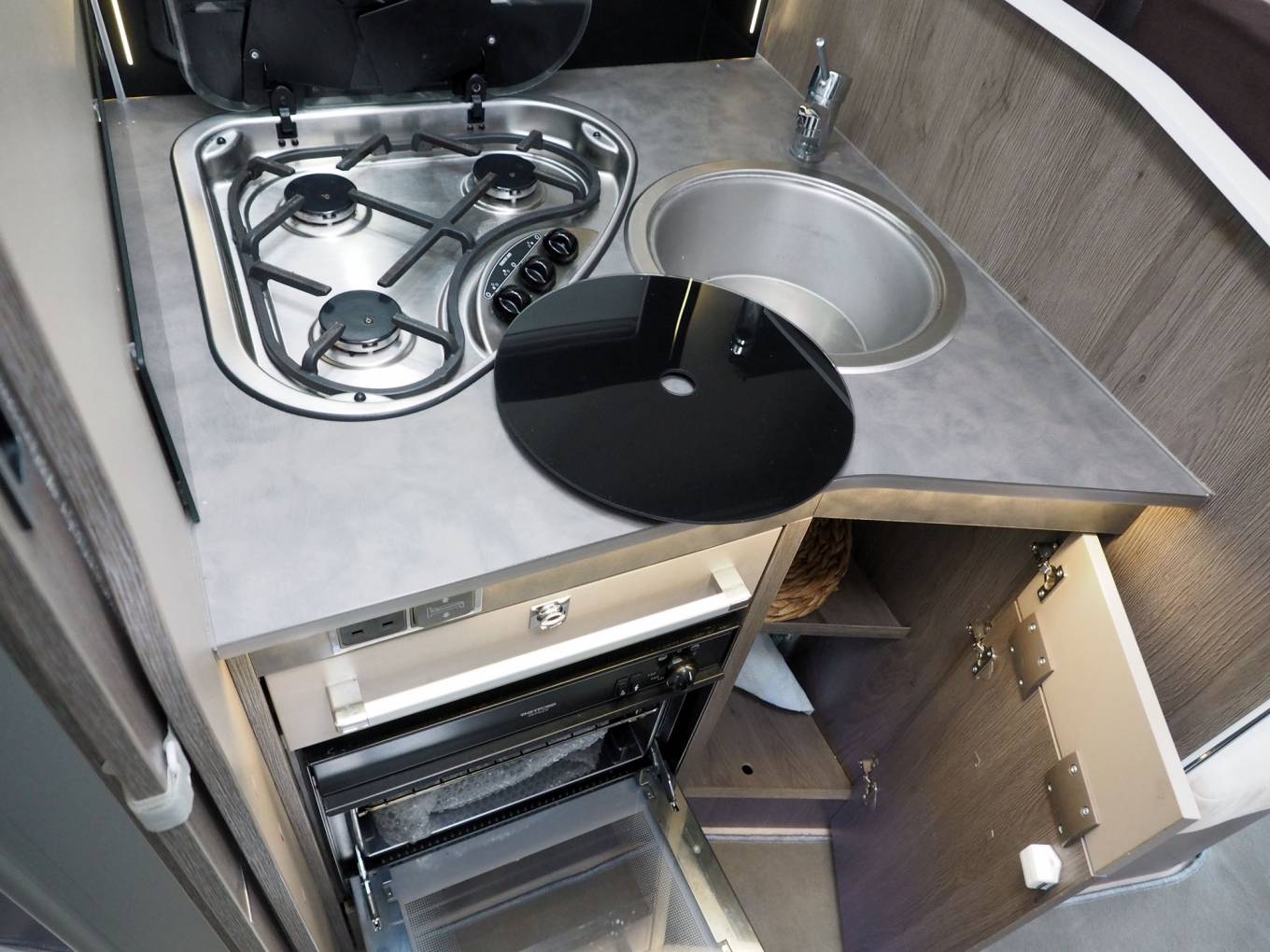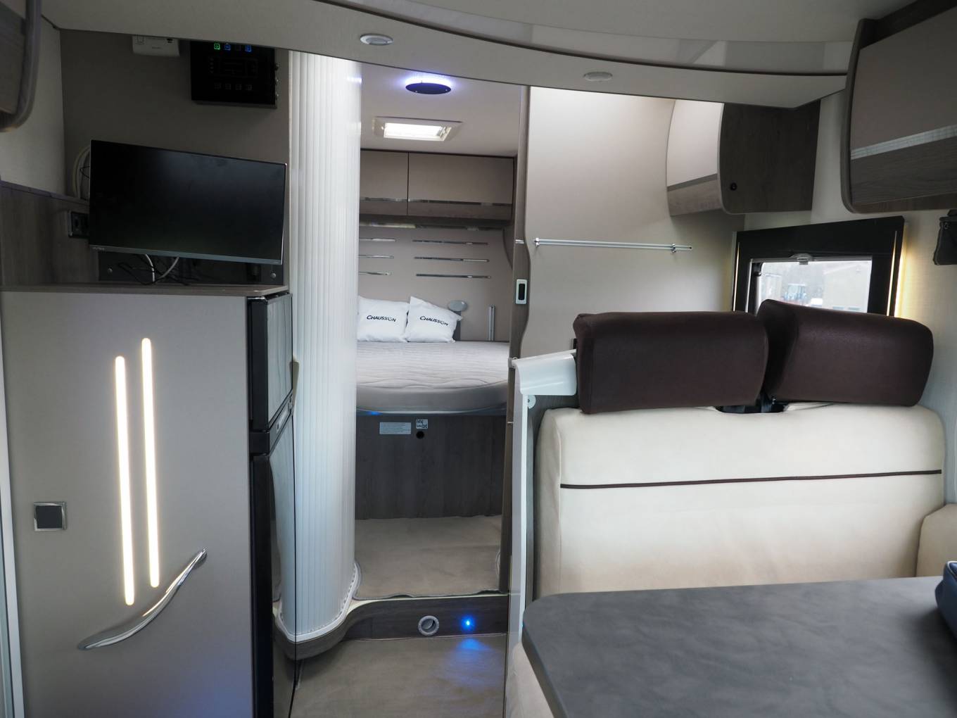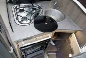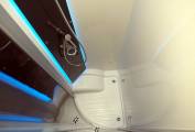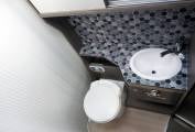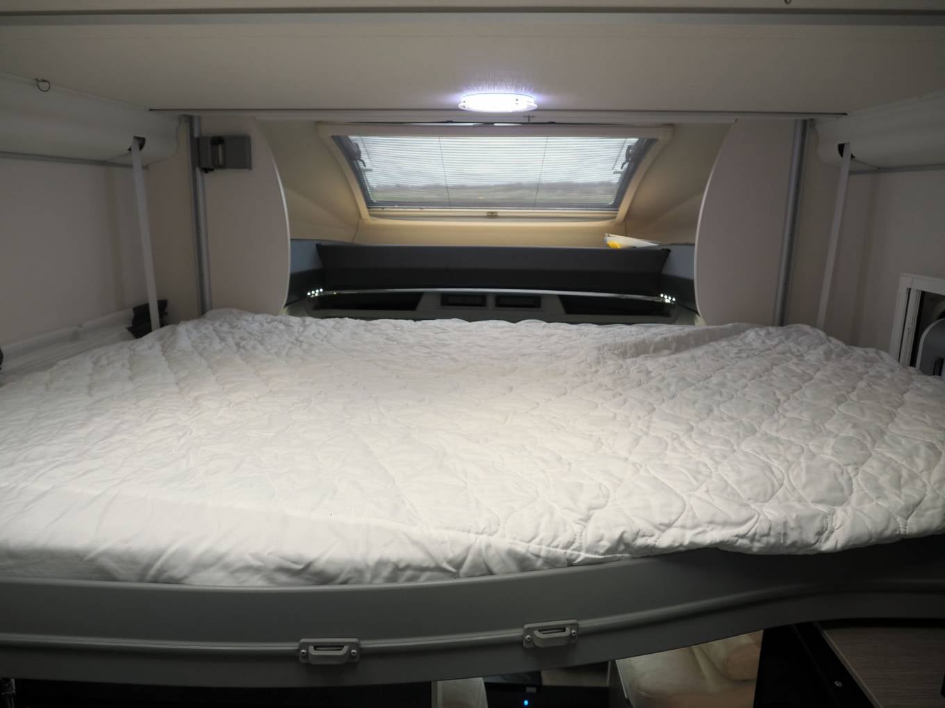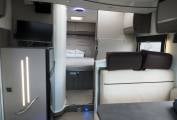 The layout comprises of a forward dinette with swivel cab seats around a multiposition table, up to five can sit here for a social. It's a light and airy space with good headroom and an opening sunroof. Midships, you will find a well equipped kitchen with large fridge freezer, gas hob, oven and grill, plus a range of storage options. The washroom and separate shower cubicle straddle the aisle and can be screened off from the dinette for privacy, offering private bedroom changing space. Heating and hot water are via the Truma Combi dual fuel system. The rear bed is height adjustable, allowing maximum use of the garage space in the highest position, or a low bed with easy access. Over the dinette, another double bed lowers electrically from the roof, with access ladder and side protection nets.
