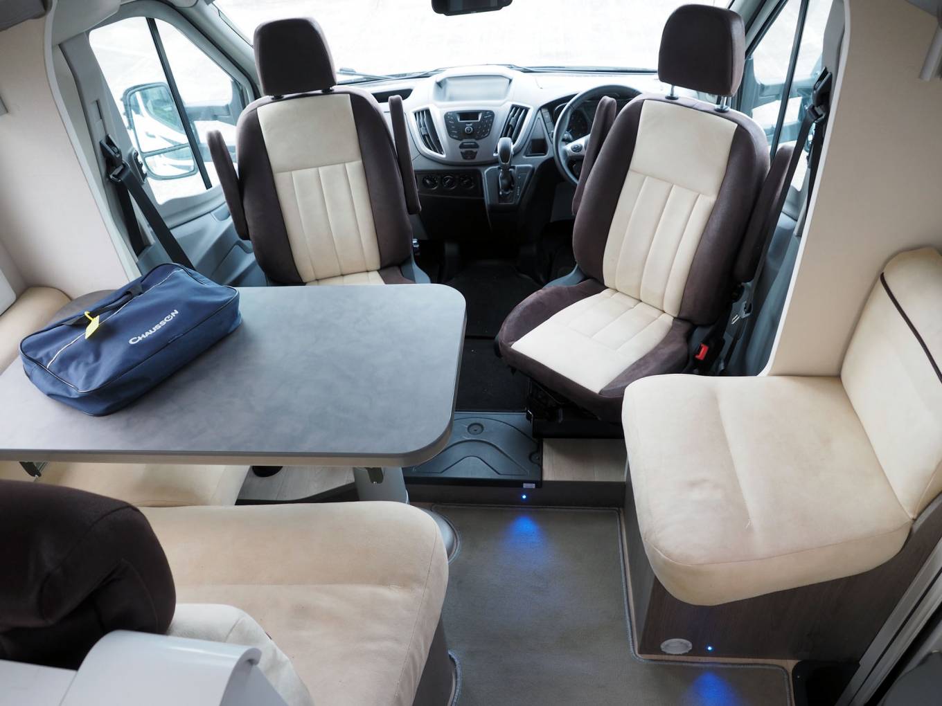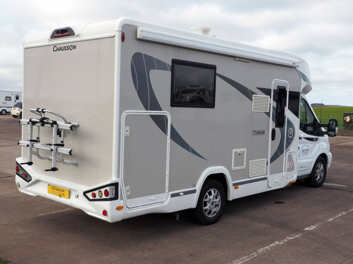 Powered by the Ford Transit 170bhp engine through a fully automatic gearbox, the Chausson is easy to drive, with driver aids including rear view camera, cruise control and cab air conditioning. Outside features include roll out sun canopy awning, 2 bike rack, service hatch for water and electrics, twin access doors to the garage. An aftermarket tracking system it is fitted, subscription is required.