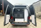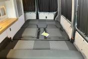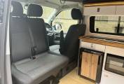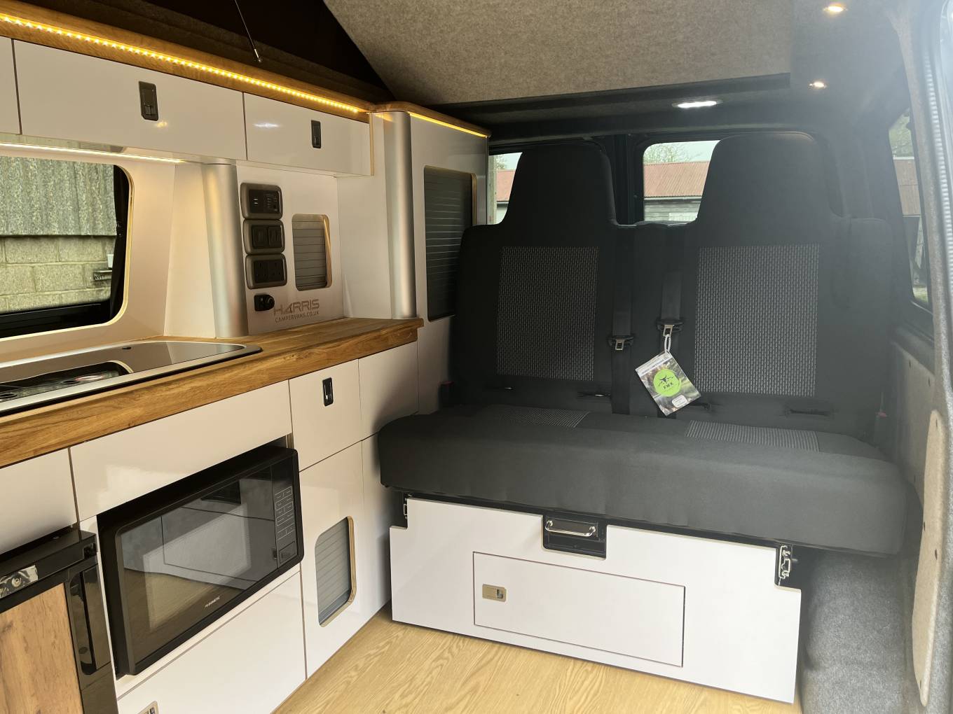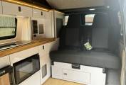 The layout includes a Fabworx Immix bed that folds out from the rear seats, allowing the van to function as both a passenger vehicle and a sleeping area, this conversions also include a Austops pop-top roof, which creates standing room inside the van and adds an additional sleeping area above so making comfortable for 4 people. The passenger seat is fitted with a sliding swivel base by Rusty Lee so making an easily converted social area for entertaining. This makes the camper suitable for couples or small families.