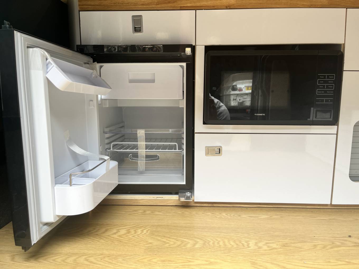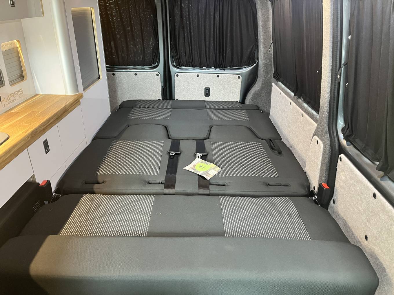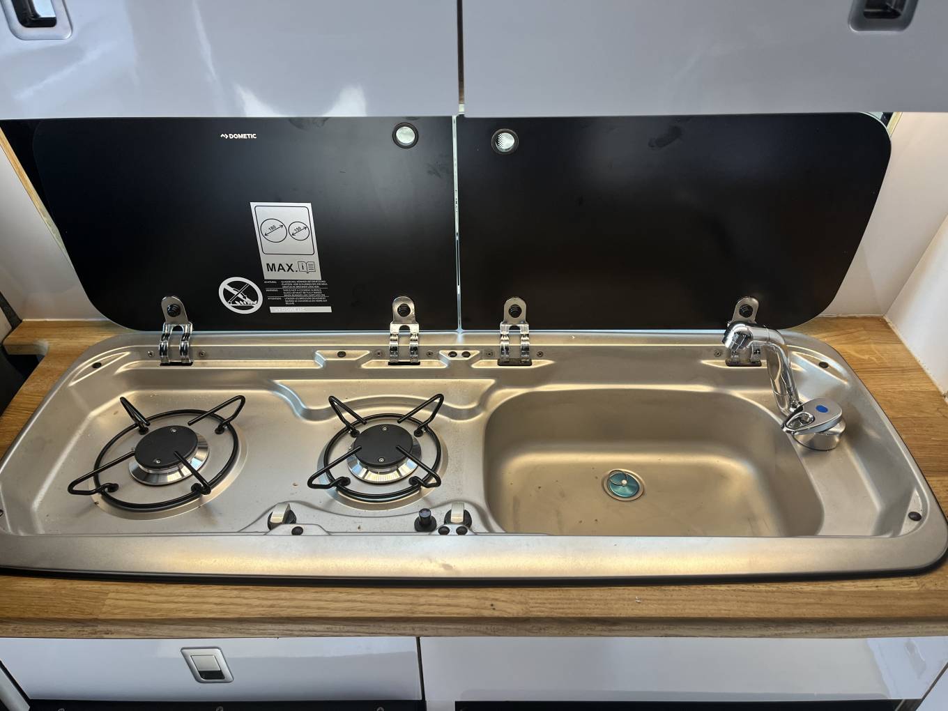 Storage is cleverly integrated into cabinets and side units, which houses a compact kitchen setup. This includes a two-burner gas hob, sink with 60litre underslung water tank, fridge/freezer, and workspace for preparing meals. LED lighting, leisure battery, and USB charging points allow for comfort while keeping power consumption low, whilst the 100w solar panel keeps the battery topped up and the diesel heater keep you warm for off grid adventures.
