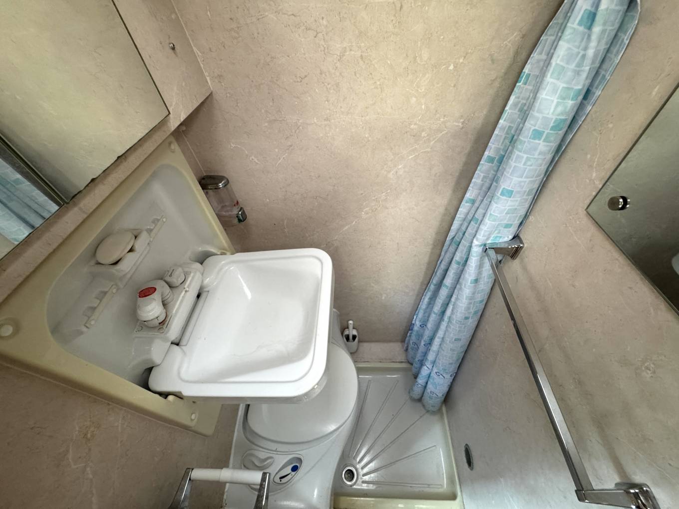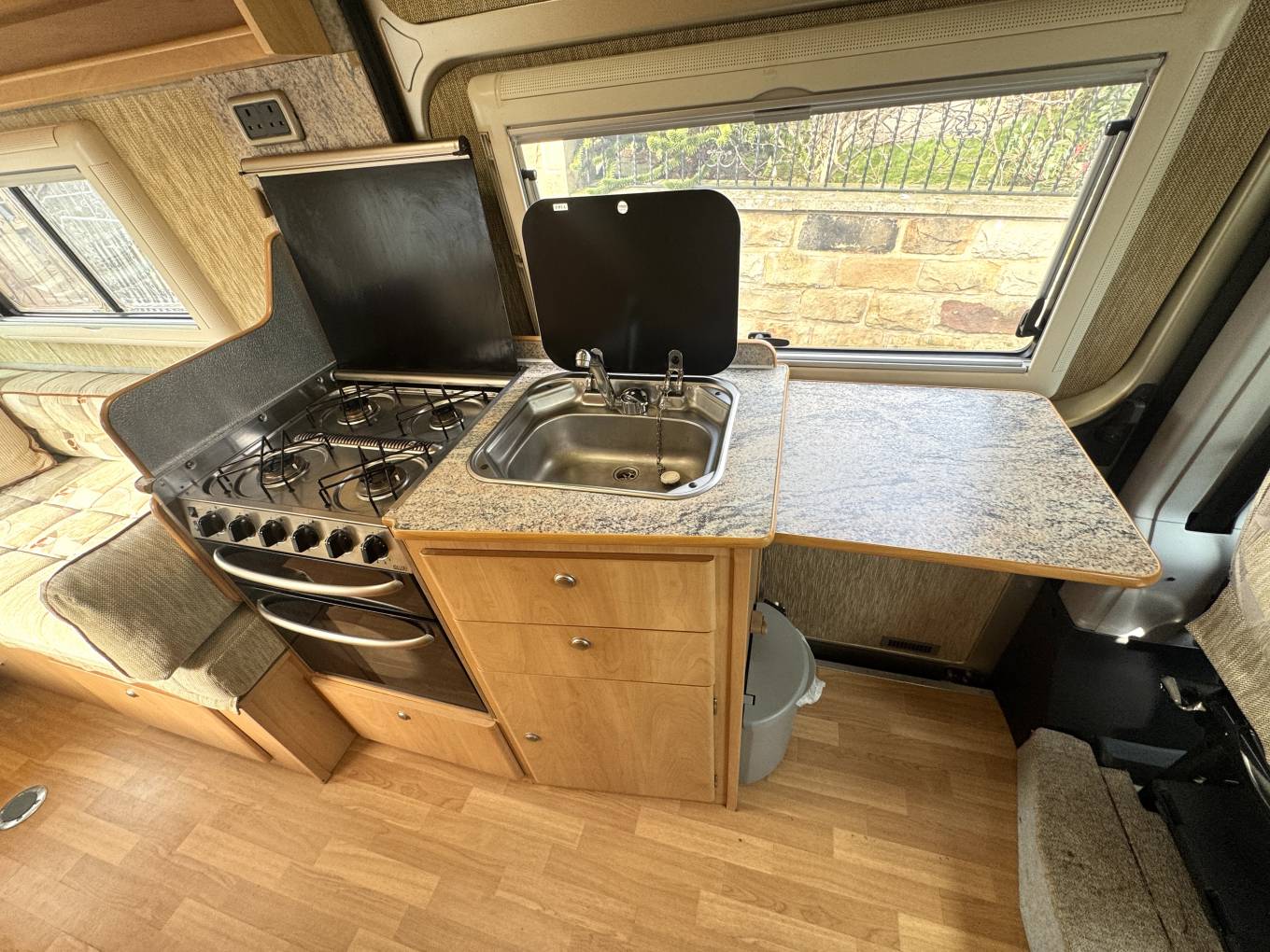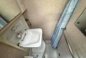 Moving forward, the side kitchen is equipped with a gas hob, oven and grill, adjacent fridge with freezer box, sink with running water and storage cupboards for kitchen equipment and supplies. Opposite the kitchen is the washroom which includes a cassette toilet, hand basin and shower tray with curtain.