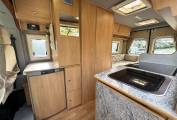 The Devon Aztec offers a practical layout within a compact campervan. At the rear there is a spacious lounge area with opposing bench seats and a rear bench forming a U-shaped seating arrangement. This creates a comfortable space to relax during the day, with large windows allowing plenty of natural light into the living area. In the evening this area converts into a generous double bed.