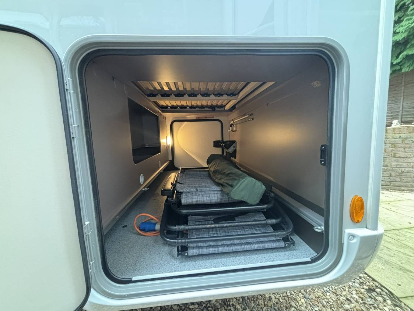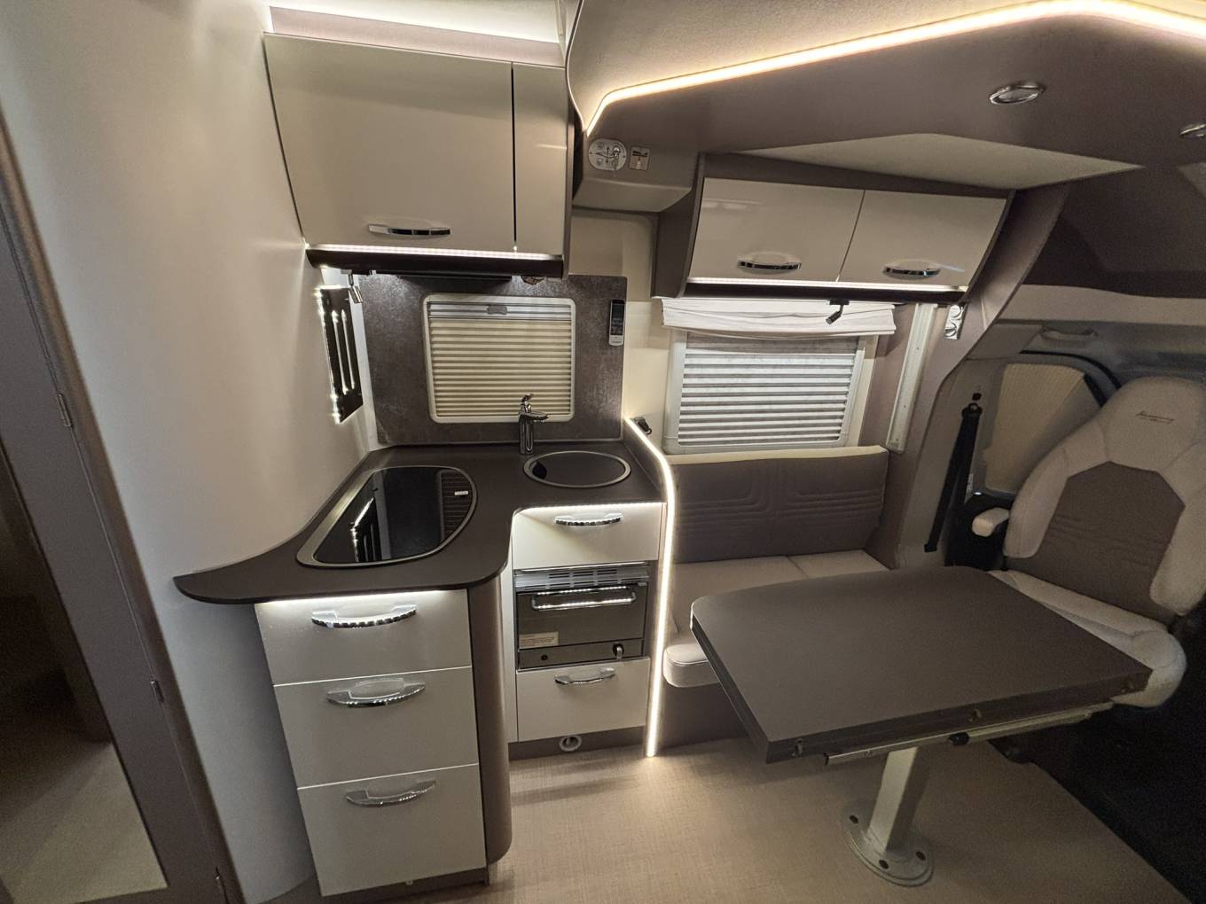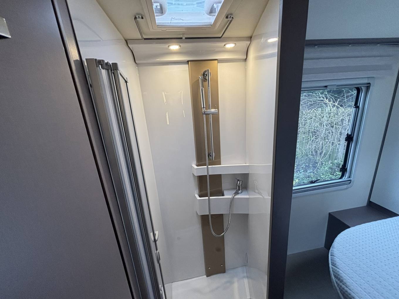 The interior remains as-new, with the shower never having been used and a full set of original carpets that are completely unused. The layout is spacious and practical, featuring a comfortable lounge area with an electric drop-down bed, providing additional sleeping accommodation while maintaining generous living space.