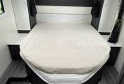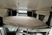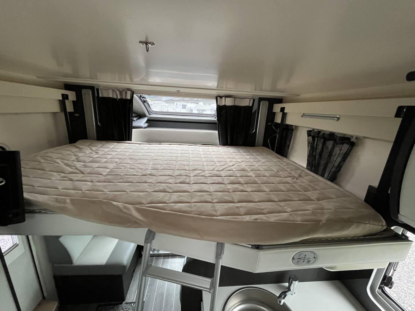 Sleeping: 2 separate sleeping areas including a raised fixed double bed to the rear and an electric/manual drop down double bed in the lounge/dinette area accessed via a ladder.