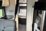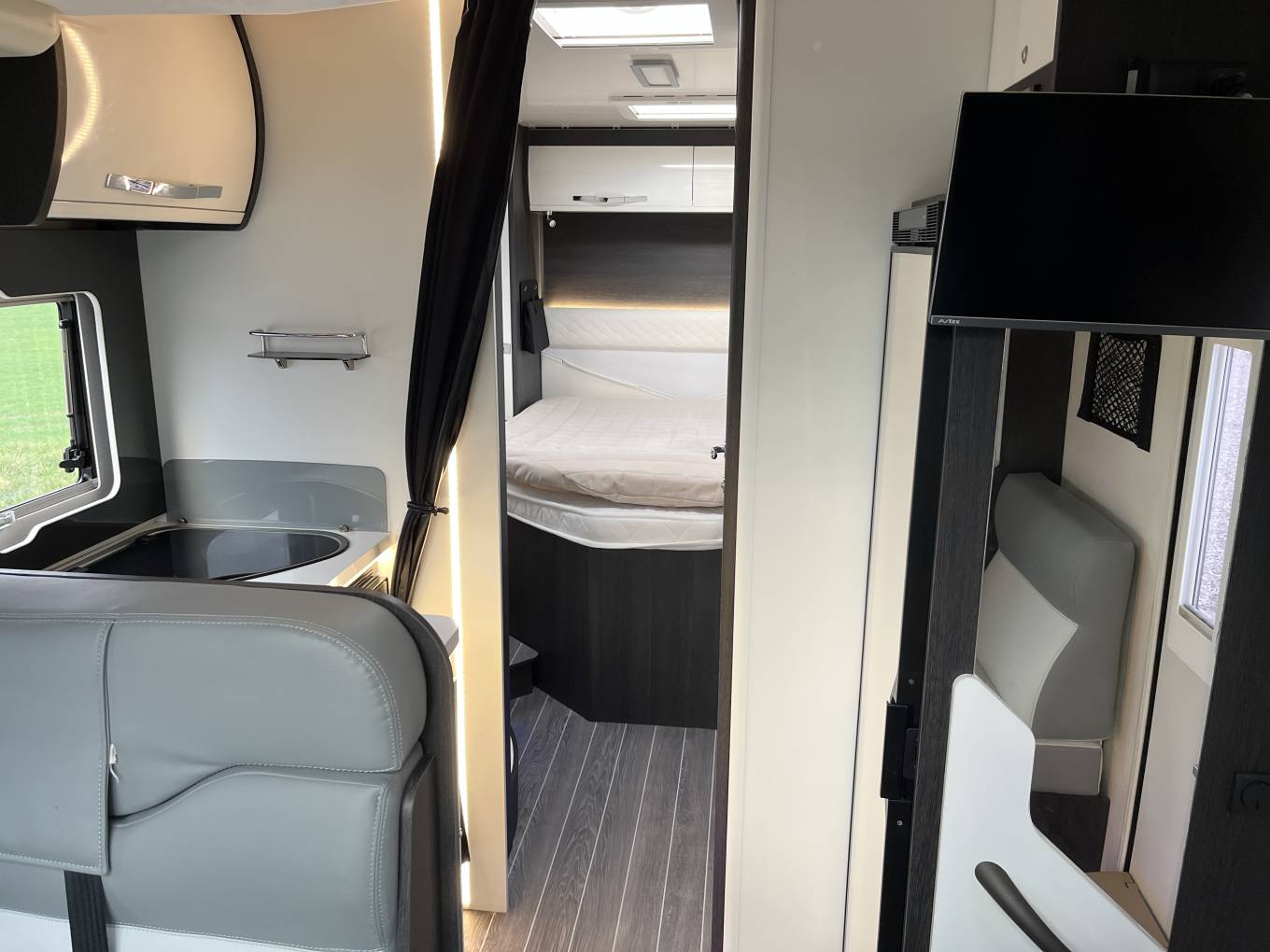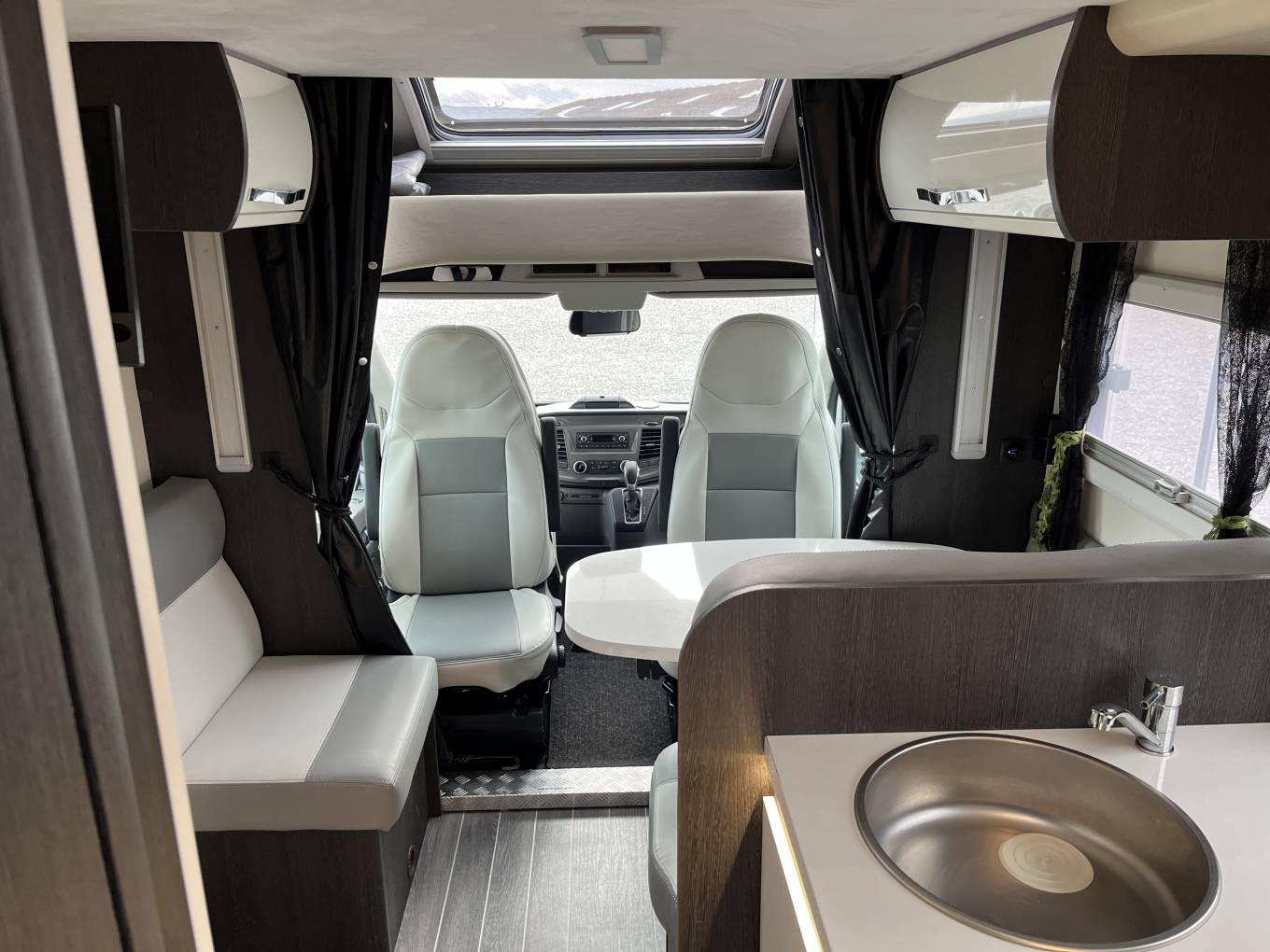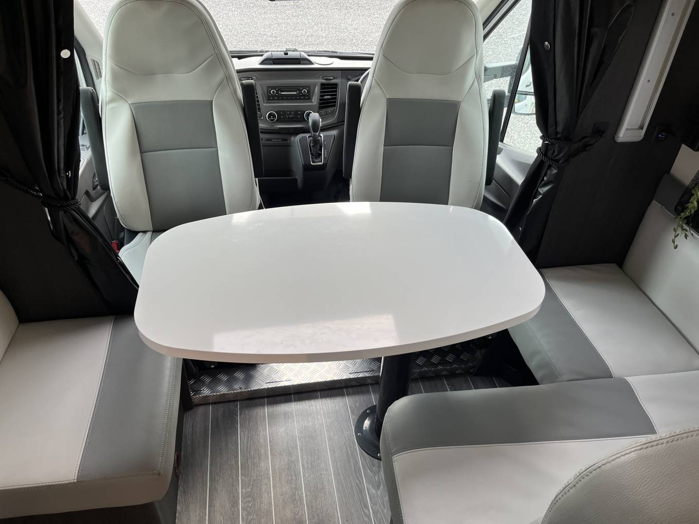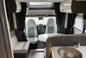 Living: Front lounge providing a specious seating area with side sofas and a large adjustable fixed table. Both cab captain chairs swivel to face the living area. LED spotlights and overhead locker storage. There is a large garage space under the rear bed, accessible from either side of the motorhome.