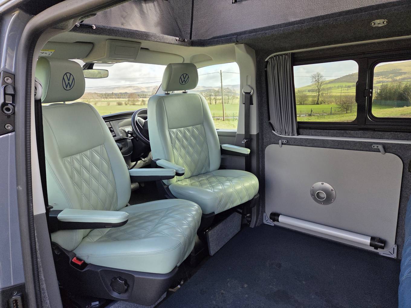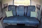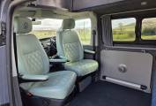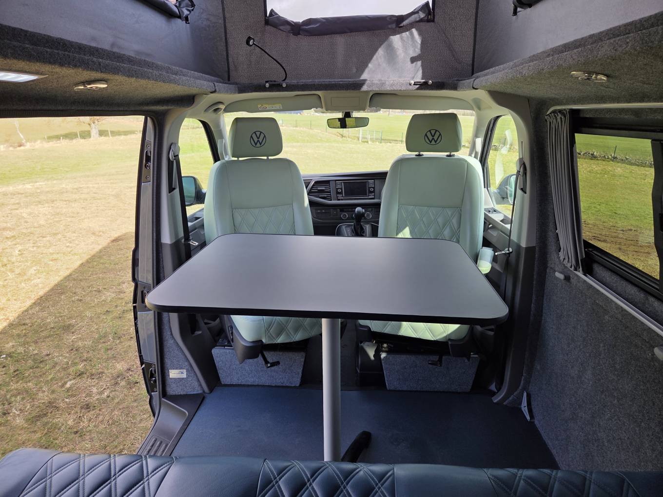 The front and rear seats are complete with VW logo luxurious leather, ivory and blue combination. There is a foldaway table that when in position with the seats rotated inwards, creates a convivial entertaining and dining space.