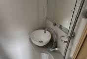 The washroom is compact yet practical and includes: