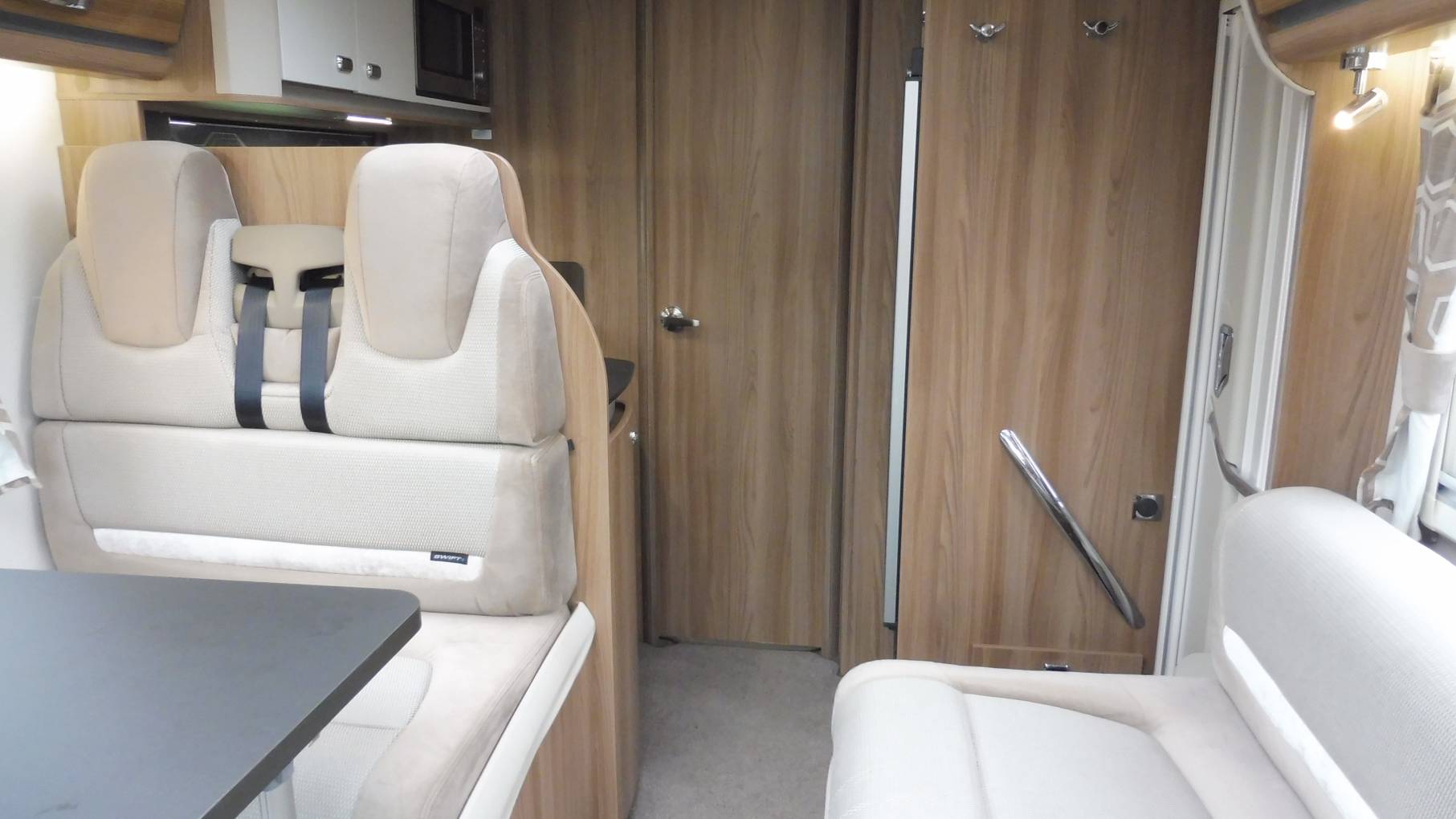 Entering through the habitation door you have the lounge and dining area to your left, with a side sofa on the near-side and two forward facing seats that have 3-point seat-belts on the off-side. There is an extendable dining table which can be stowed away if you wanted more space, plus there are aircraft style lockers and under seat storage available. With the driving seats there is ample room to entertain 6 people if you so desire. The lounge area benefits from two large skylights which make a bright and airy space. A Teleco satellite system and Wi-fi router ensure a broad array of entertainments are available when required.