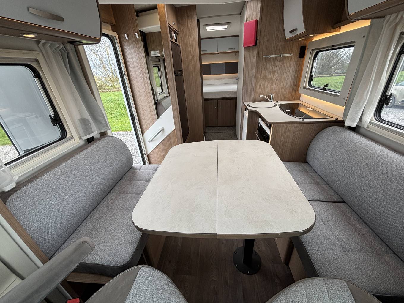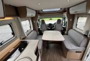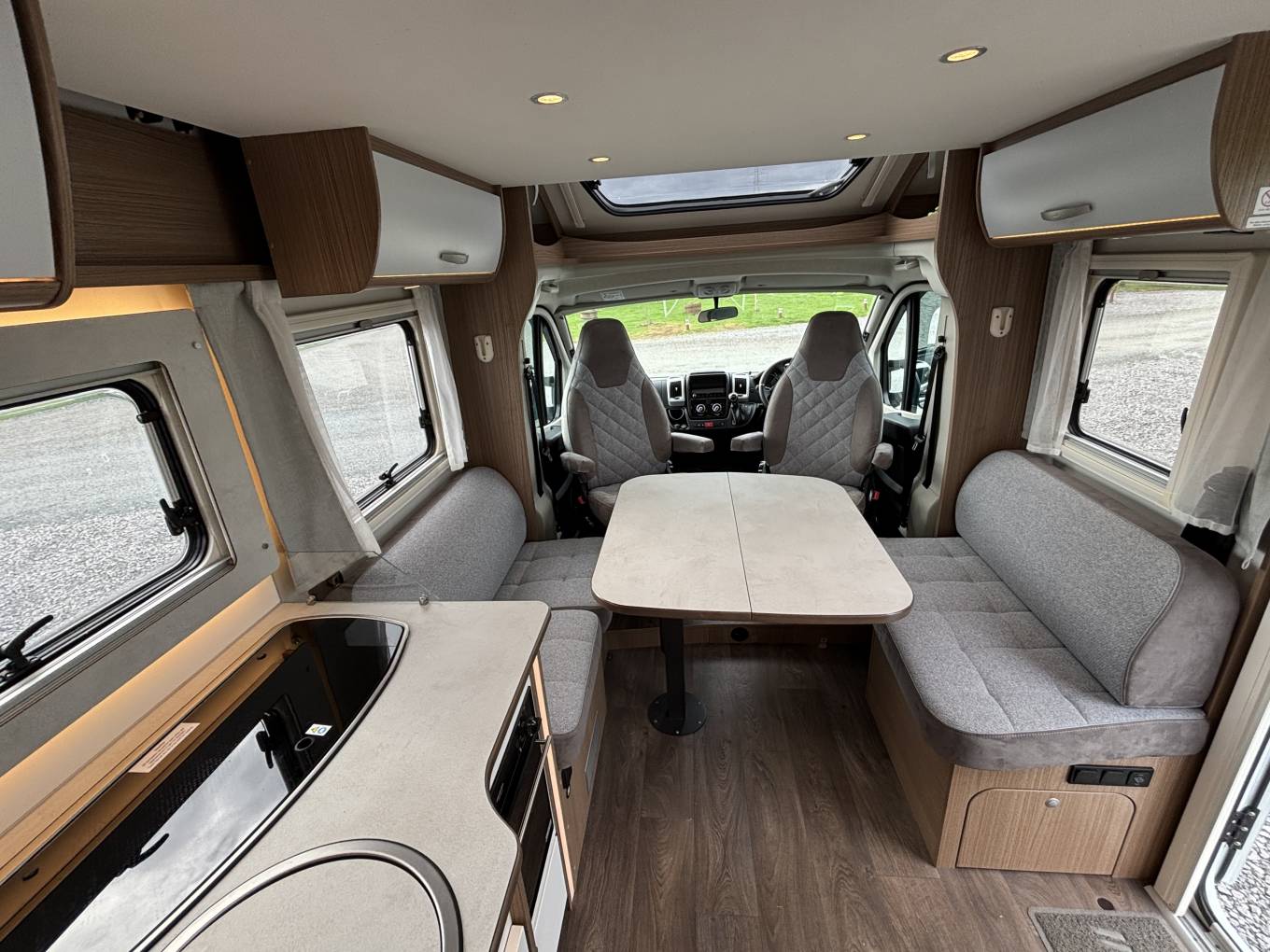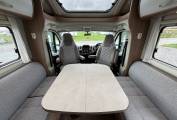 You enter the habitation door of the motorhome on the drivers side with the relaxation and dining area to your right. This good sized area has 2 side facing sofas and both the driver and passenger seats which swivel to give a roomy comfortable feel with a bi-fold pedestal table. The side facing sofas can also be converted to give 2 extra belted seats for travelling if required.