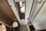 Behind the kitchen area, is a self contained shower cubicle and opposite is the wash room with a Thetford electric flush w.c. and washbasin with mirror and vanity unit. This area has a clever door design to the toilet room that combines the adjacent shower cubicle and toilet room to give a spacious feel to a private shower room.