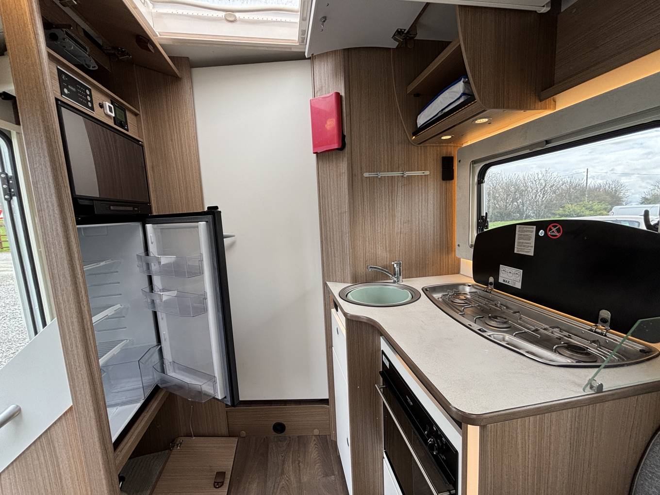 Behind the seating area is the kitchen with drawer and cupboard storage, worktop space, sink with mixer tap, 3 ring gas hob, Thetford gas oven and grill and a 164L Thetford 3 way fridge freezer.