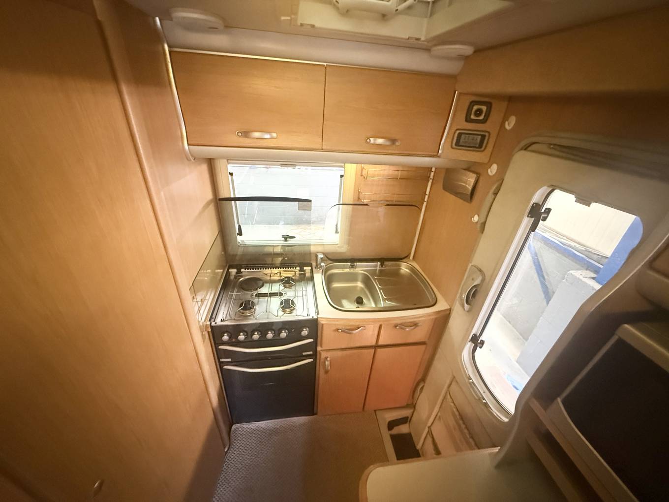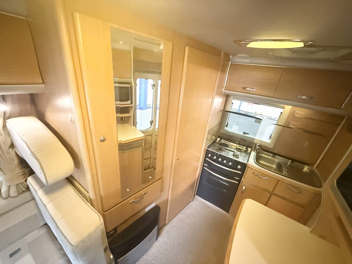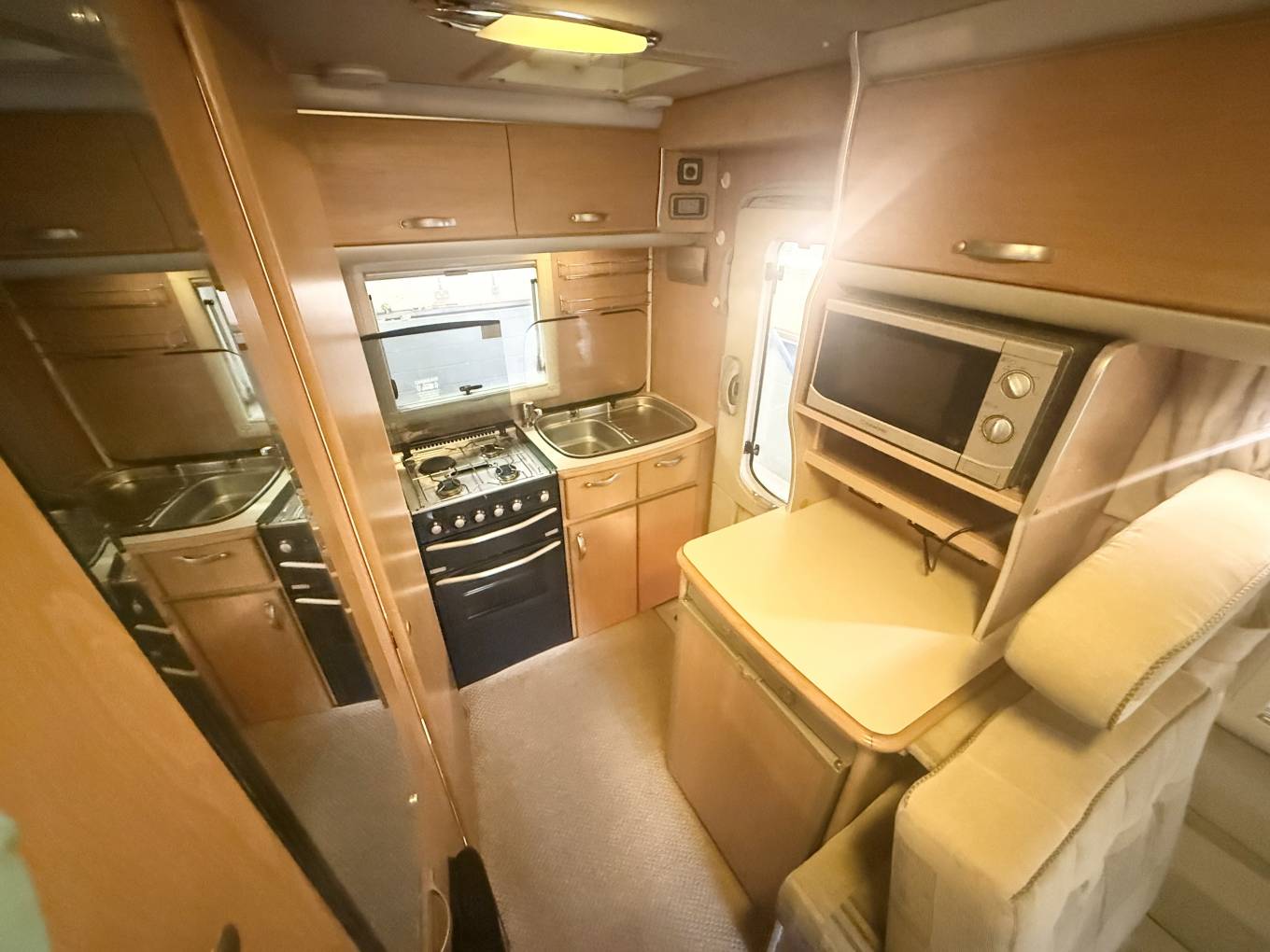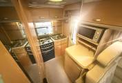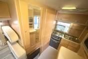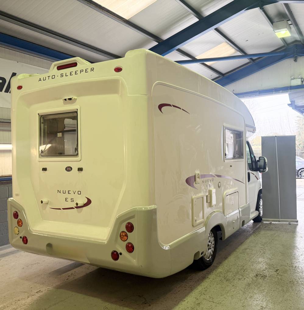 Introducing this popular Based on a Peugeot Boxer chassis. On entering the Nuevo we have an end kitchen with Caprice oven and grill and a three gas ring hob with a useful additional electric ring, alongside a single bowl sink and a Dometic fridge/freezer. The shower/wc facility has a very cleverly designed swivelling wall with attached hand basin. This provides a separate shower area with a sliding partition which is an excellent feature of this motorhome. The living area has a Trumatic gas fired heating system, two bench style seats which convert into two single beds or a large double bed. It also benefits with ample below storage along with a fold away dining table. The cabin area has swivel seats, manual gearbox, 4 seatbelts and a radio/cd player and air-con.