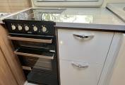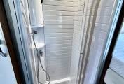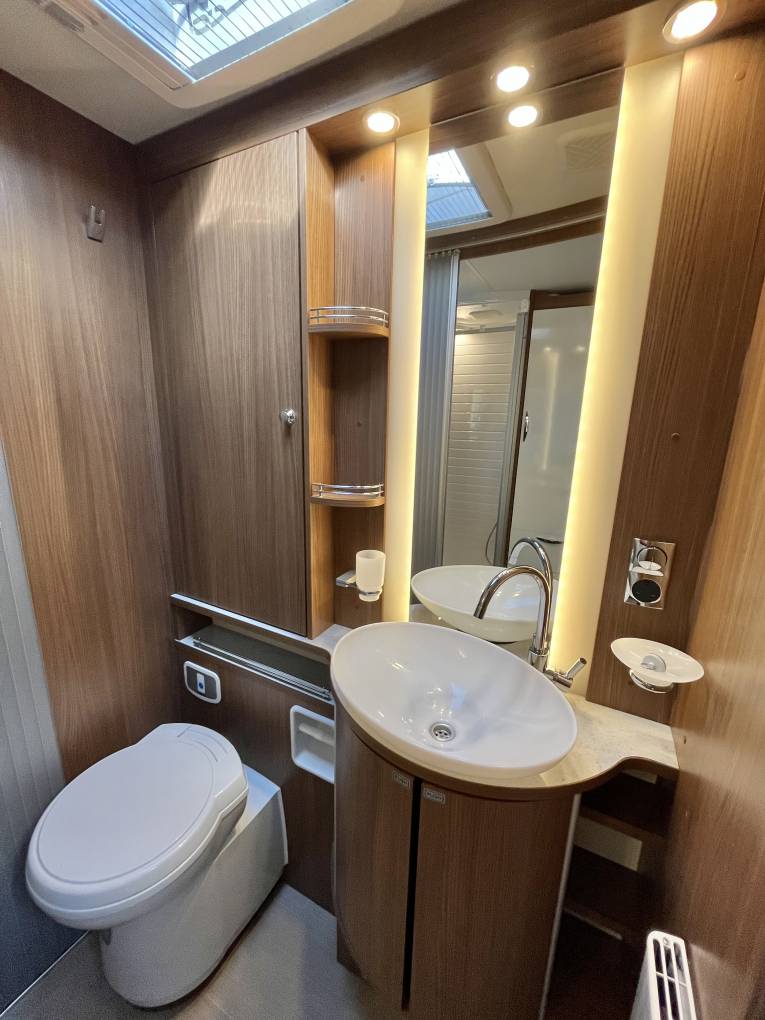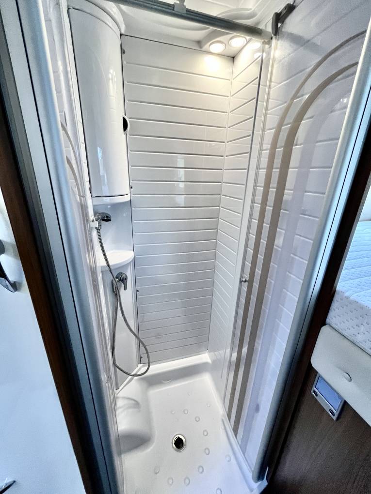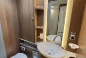 To the rear of the kitchen is a sliding door to separate the rear bedroom and wash / shower room from the habitation area. The toilet is on one side with a swivel head fresh water flush toilet, a large vanity sink with storage below, mirror and wall storage. On the opposite side is the separate shower cubicle with perspex doors to close & a large hanging wardrobe with 3 drawers below.