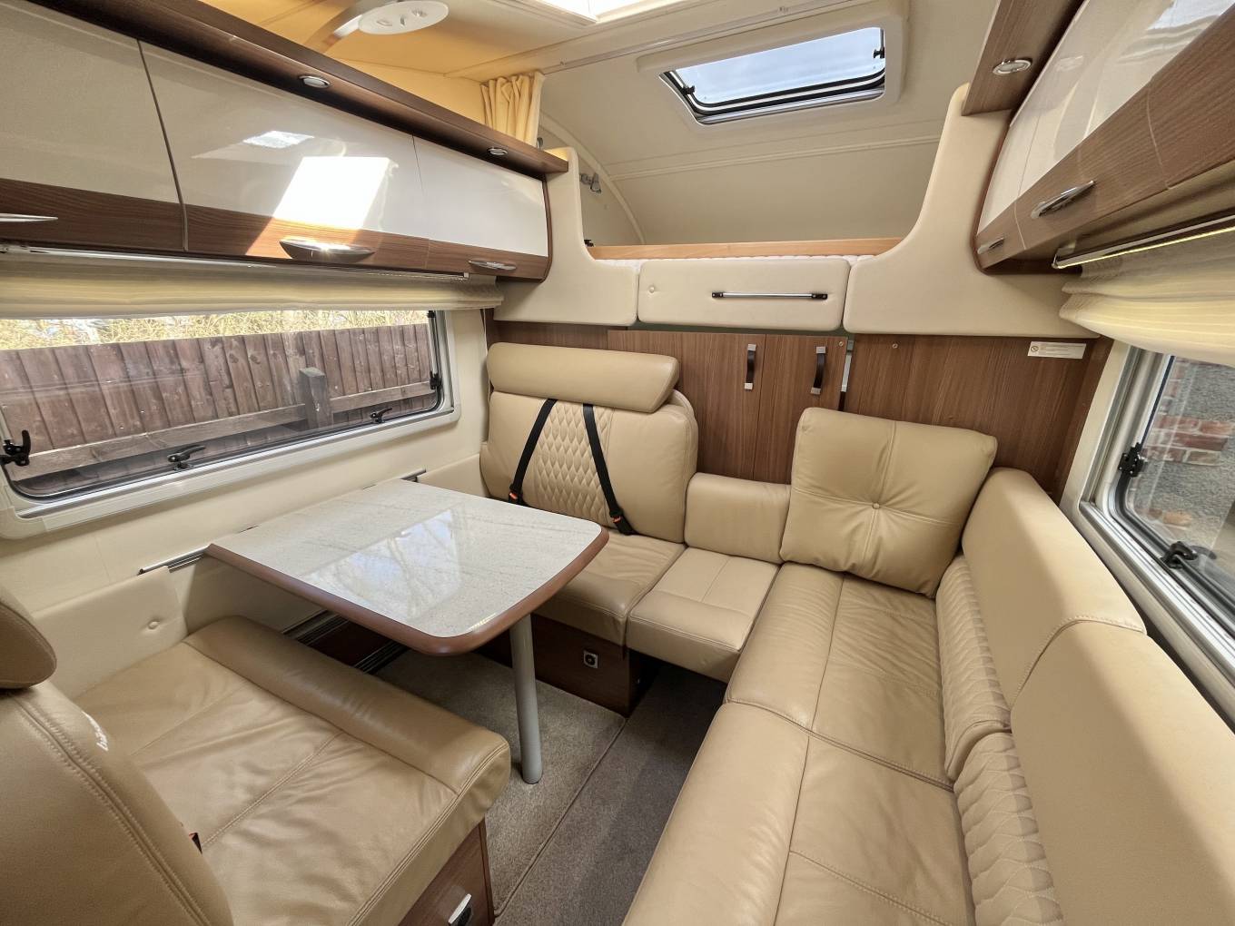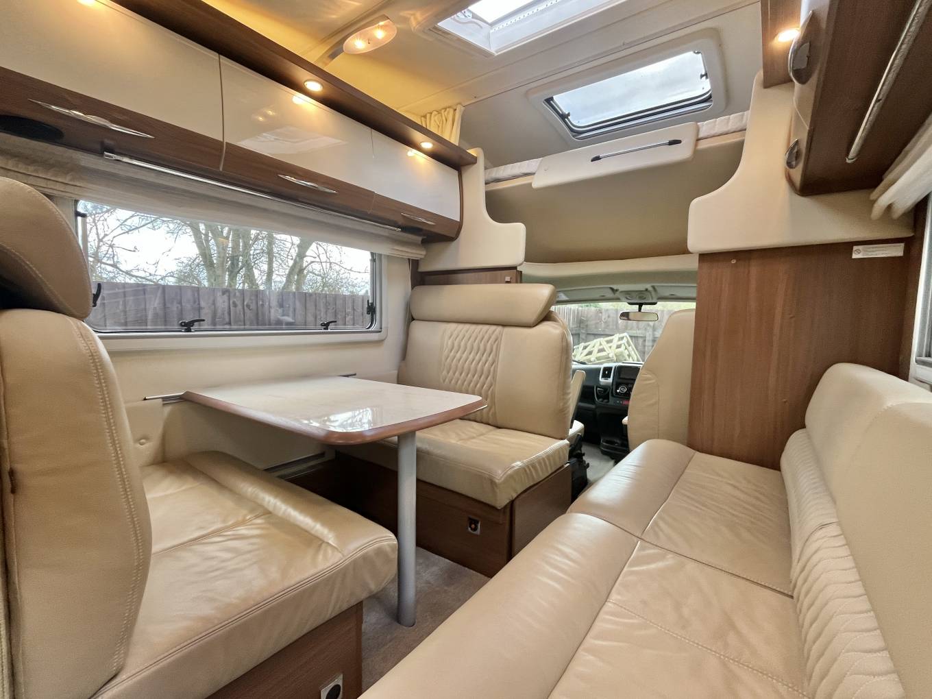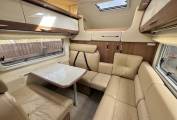 As we enter the vehicle, immediately to the right is the dinette, there is a long reclining sofa to the side of the habitation door which has infill pieces so that it can make into a huge L shaped sofa. On the opposite side is the dinette with 2 forward facing and 2 rear facing seats with 3 point belts for all. You could easily seat 8 people around if you were entertaining on site. When this area is not in use then the table drops down to make a small double with a separate single using the side sofa. To the left of habitation door is the TV point with Avtex TV, a glass cabinet and the vehicles control panel.