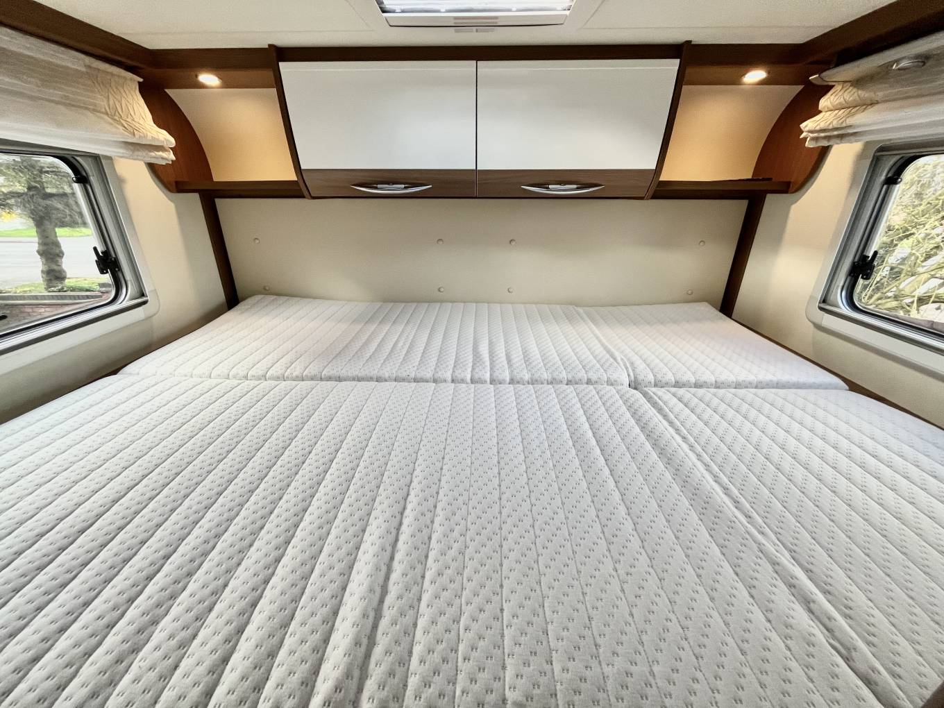 Finally the fixed rear double bed is transverse and has a 2nd Avtex TV at the foot of the bed which sits above a very large twin door rear garage.
