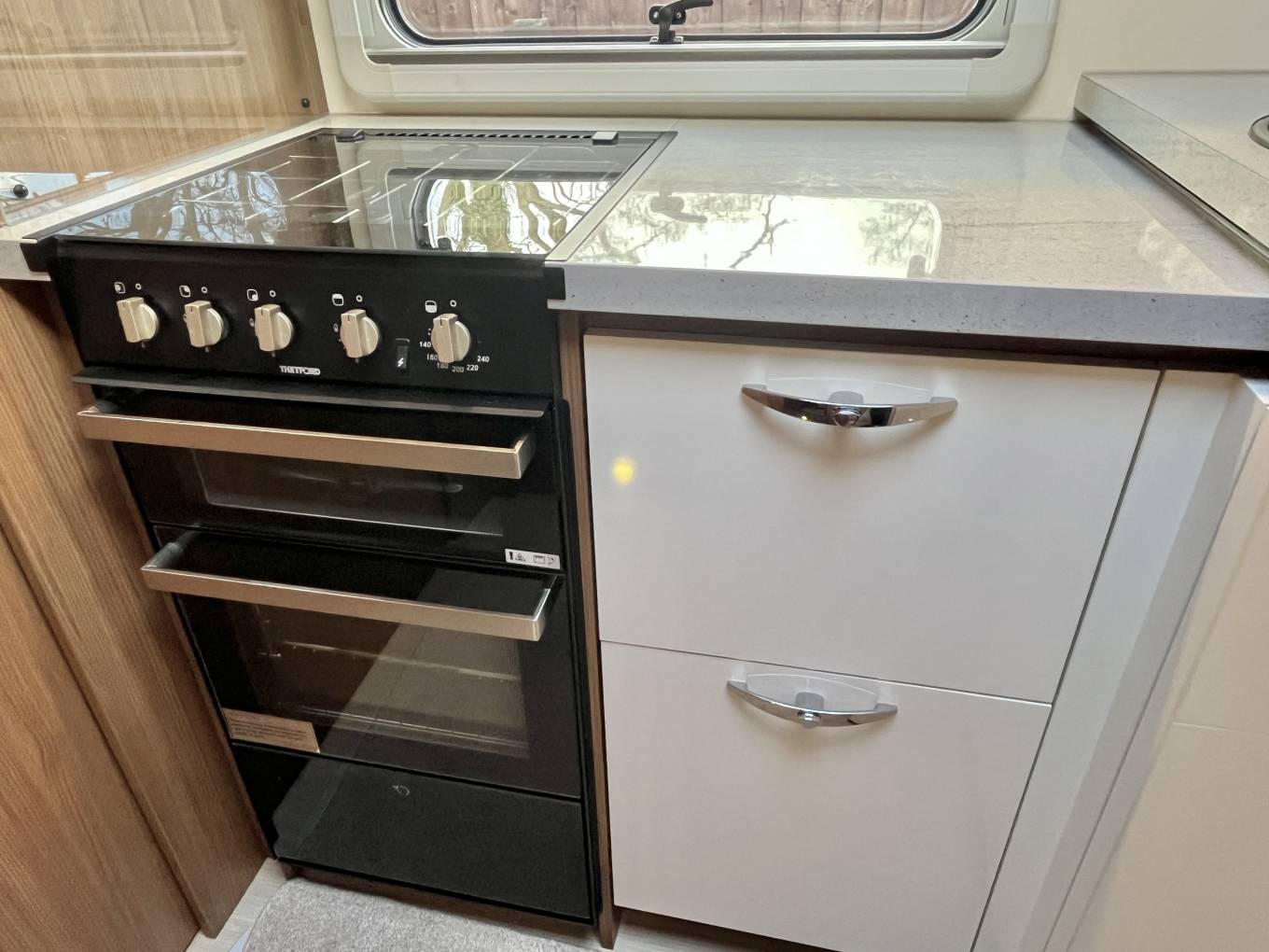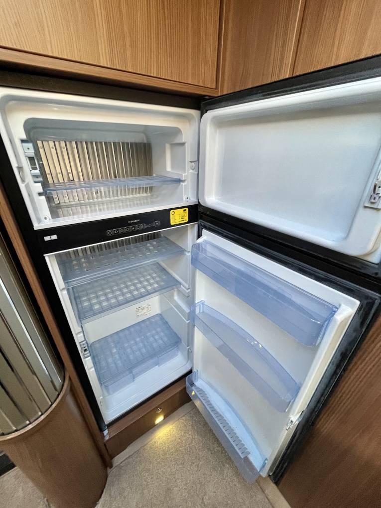 The well equipped, spacious kitchen area comprises of a separate oven and grill, 3 burner hob, sink and drainer with mixer tap and good storage both above and below the worktops. Opposite is a large 3 way fridge with separate freezer compartment and a Panasonic microwave.