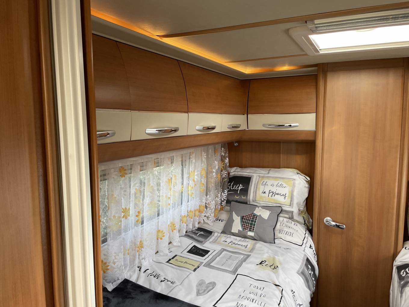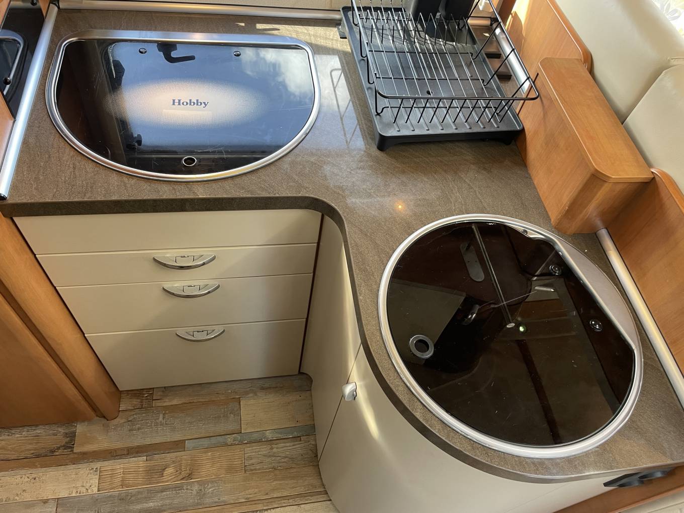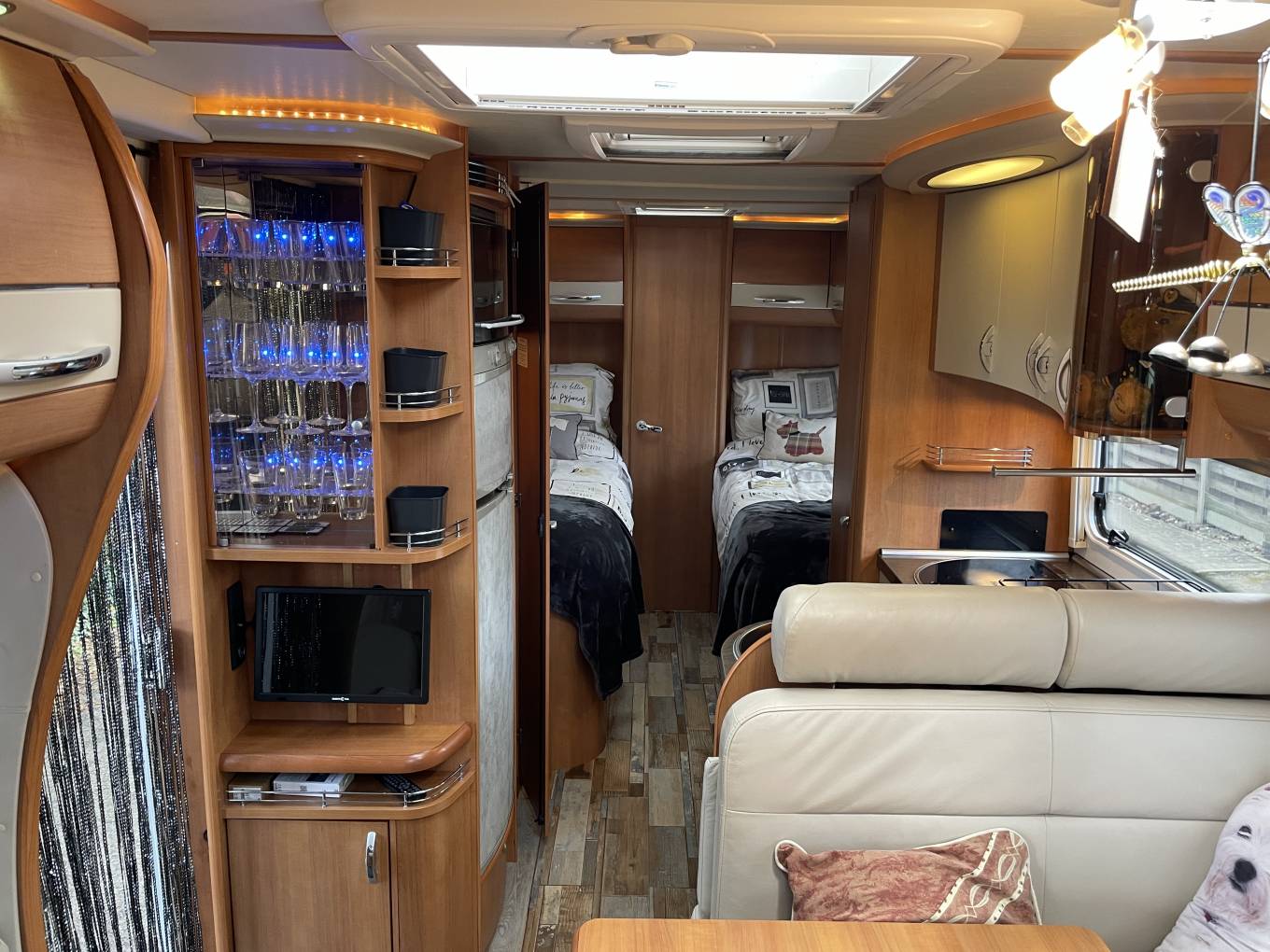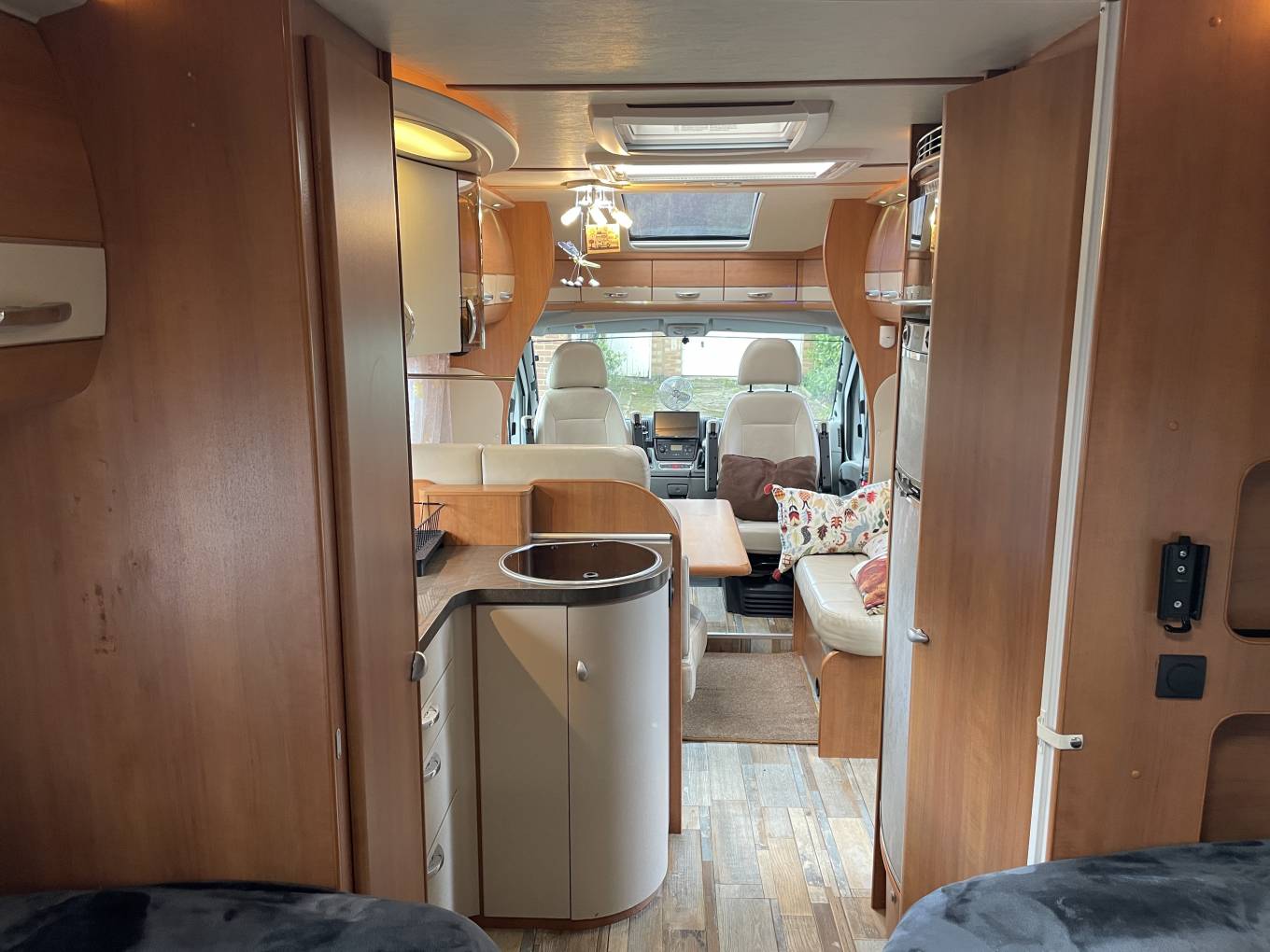 The Hobby Toskana range is known for its solid German build quality, good insulation and practical layouts, making it ideal for touring in the UK and across Europe. This example offers a bright, spacious interior with plenty of storage throughout; it’s all about space and light. The lounge is massive with plenty of room to sit back and relax after a long drive, and the swivel seats mean you can turn the cab into part of the living room in seconds. It’s got that classic Hobby "Exclusive" feel—lots of nice woodwork, high-end finishes, and a huge sunroof that makes the whole place feel bright and airy.