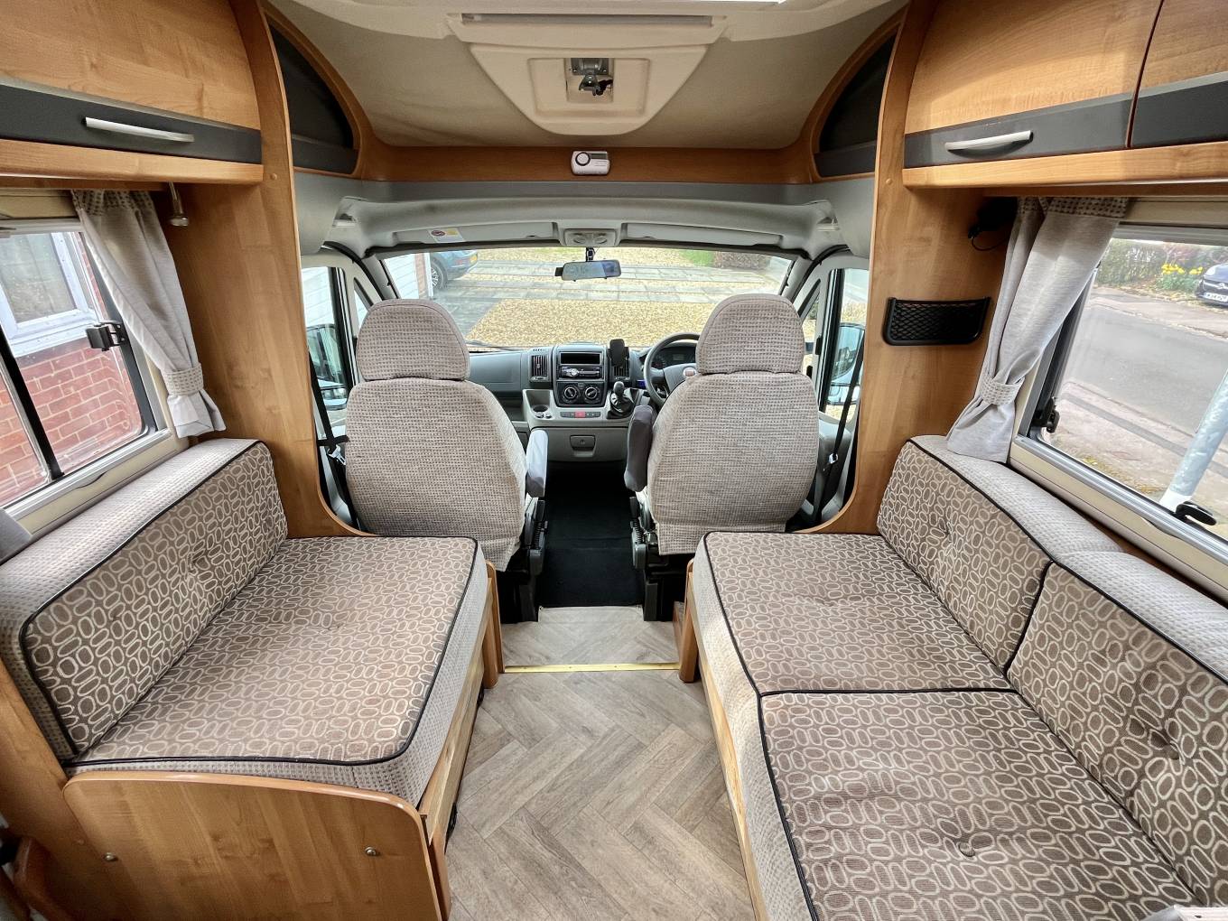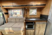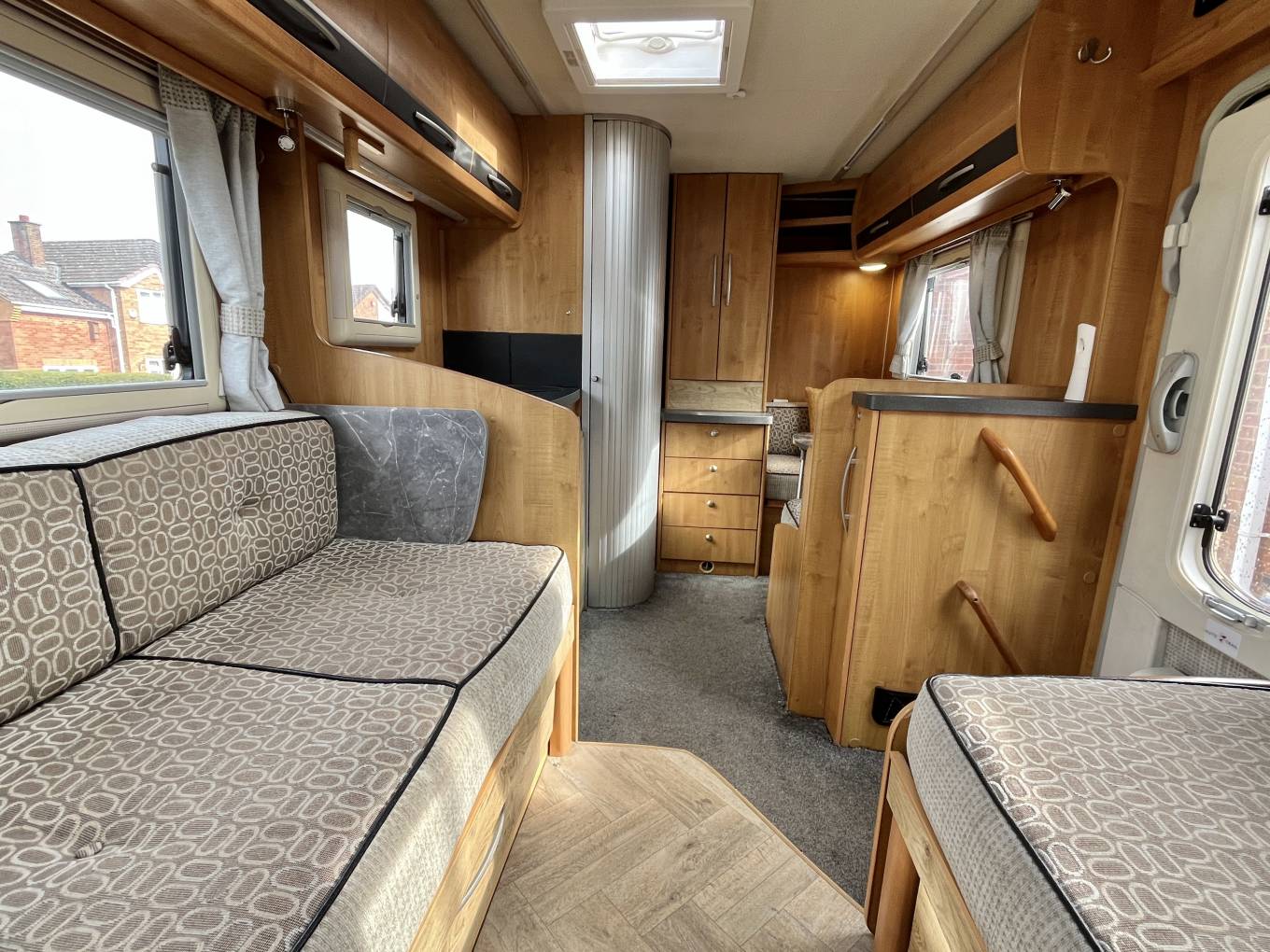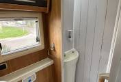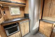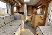 The Excel 600 D although a compact 5.99 metres feel spacious inside, the well-lit front lounge consisting of a 4 foot sofa with a single seat opposite and of course both front seats swivel into the dining/ socialising area, easily giving space for 5 people around the free standing dining table when entertaining on site.