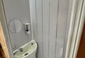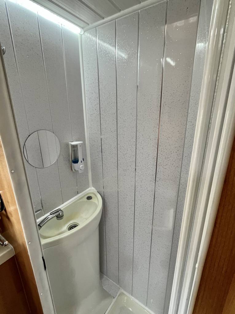 The corner washroom/shower area comprises of an electric flush toilet, mirror and overhead storage and a separate shower cubicle with vanity sink and folding shower doors.